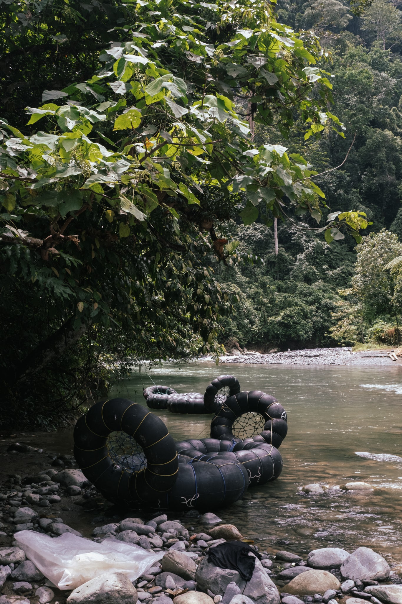 Pour finir, nous arrivons à la rivière où nous attend notre embarcation. Elle se compose de 4 grosses bouées et de filets pour rentrer à Bukit Lawang. Soyons honnêtes, on est à moitié rassurés pour notre matériel photo qu’on emballe dans des grands sacs plastiques. La descente est vraiment pleine de sensations, avec Jungle Mama, notre cuisinier devenu conducteur de bâteau qui tombe à l’eau en plein rapide. A ce moment-là, on commence un peu à paniquer quand même. Spoiler alerte : toutes nos affaires sont arrivées complètement sèches, contrairement à nous !
