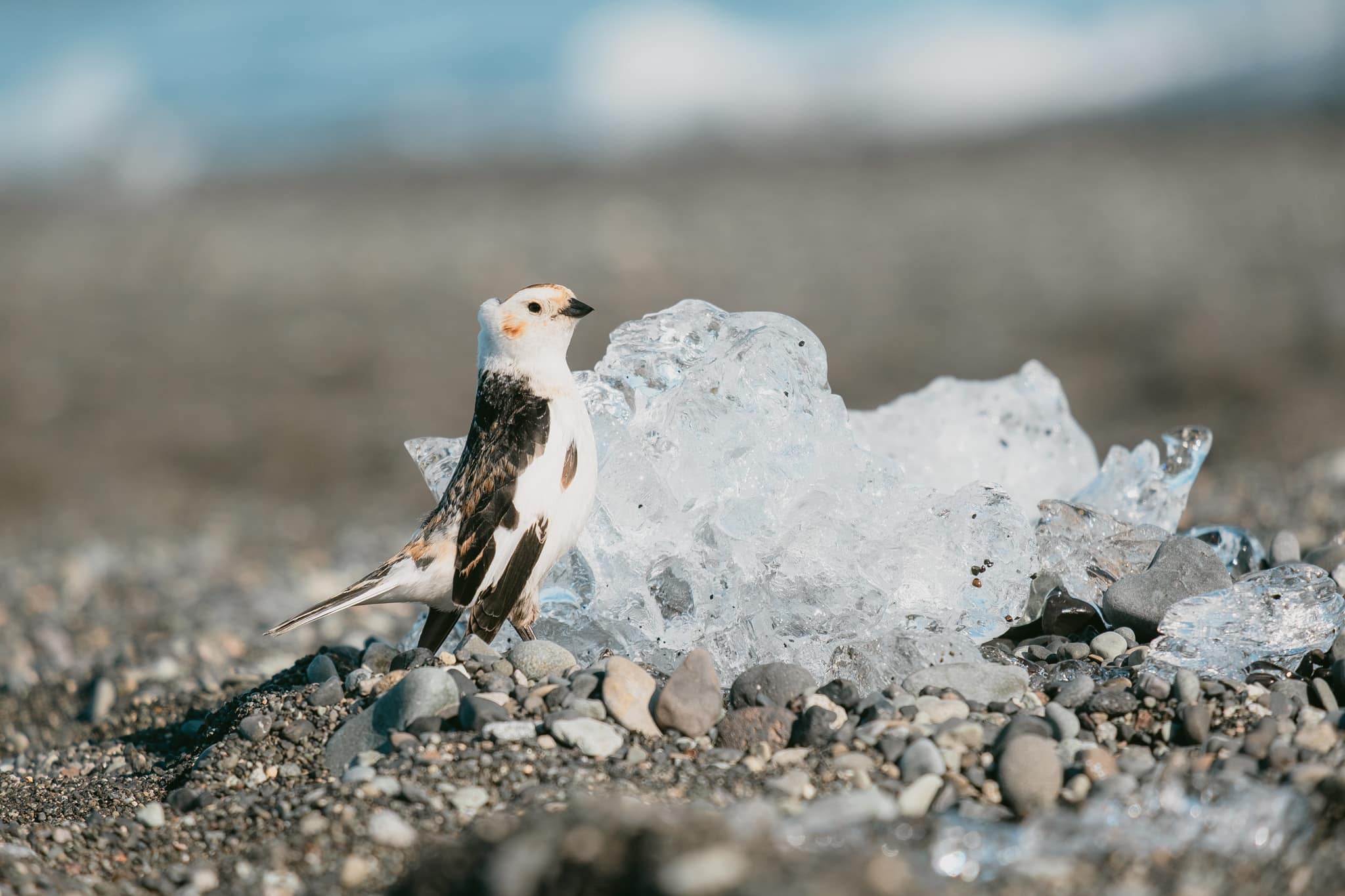 D’autre part, nous avons la plage de sable noir profond, balayée par les vagues de l’Atlantique Nord, parsemée de morceaux de glace translucides, parfois bleutés, parfois blancs, qui ressemblent à des sculptures de verre.