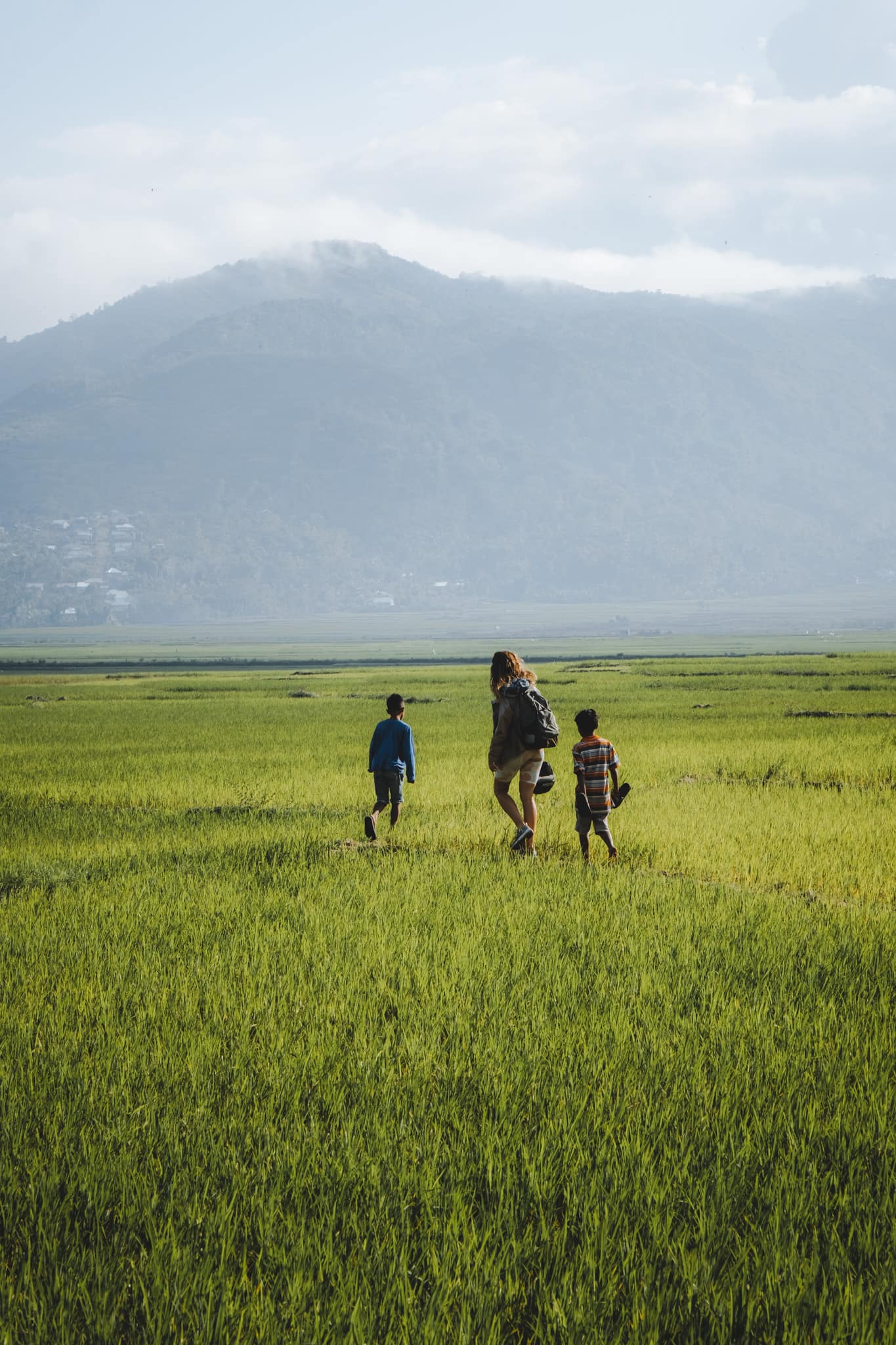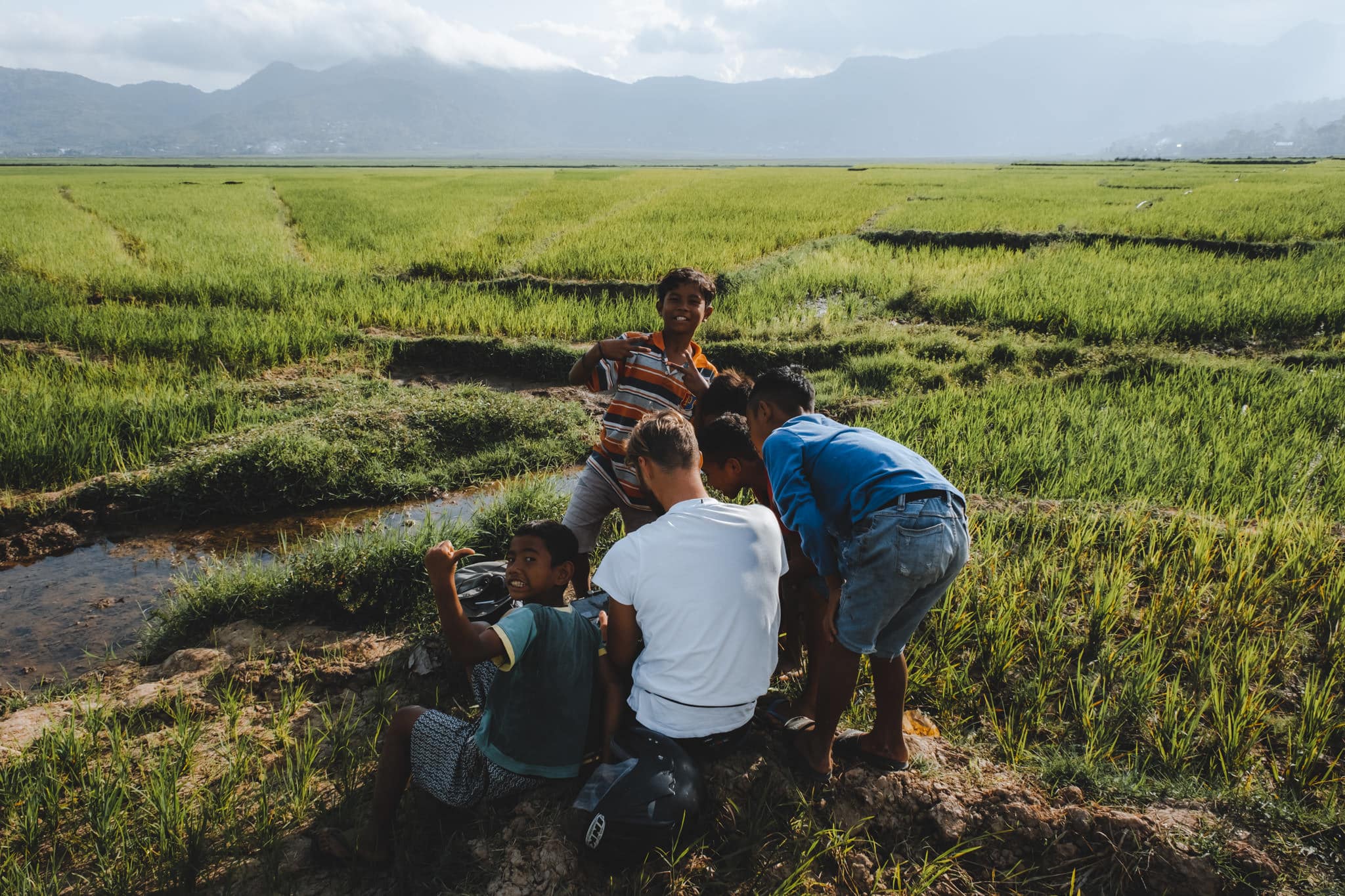 Les enfants qui étaient avec nous dans les rizières n’étaient pas agressifs, bien au contraire. Ils nous ont demandé un peu d’argent quand nous sommes revenus au scooter parce qu’ils nous avaient « guidé ». Nous ne donnons jamais d’argent aux enfants, cependant cette fois, on laissera un petit quelque chose et leur demandant de partager entre eux.