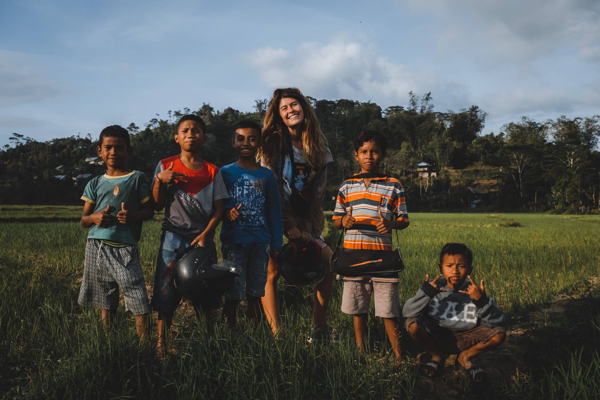 Il parait qu’il y a un point de vue, mais nous ne l’avons jamais trouvé et pour cause.. alors que nous arrivions, plusieurs enfants se sont approchés de nous en nous criant « Rice Field ». On se gare, voyant derrière les arbres un chemin et les convoitées étendues vertes. S’en est suivi une balade accompagnés de jeunes guides qui nous ont promené un peu partout et se sont beaucoup amusé avec notre drone ! Nous avons trouvé ce lieu absolument fantastique et on vous conseille d’y aller en fin de journée, avec le coucher du soleil.