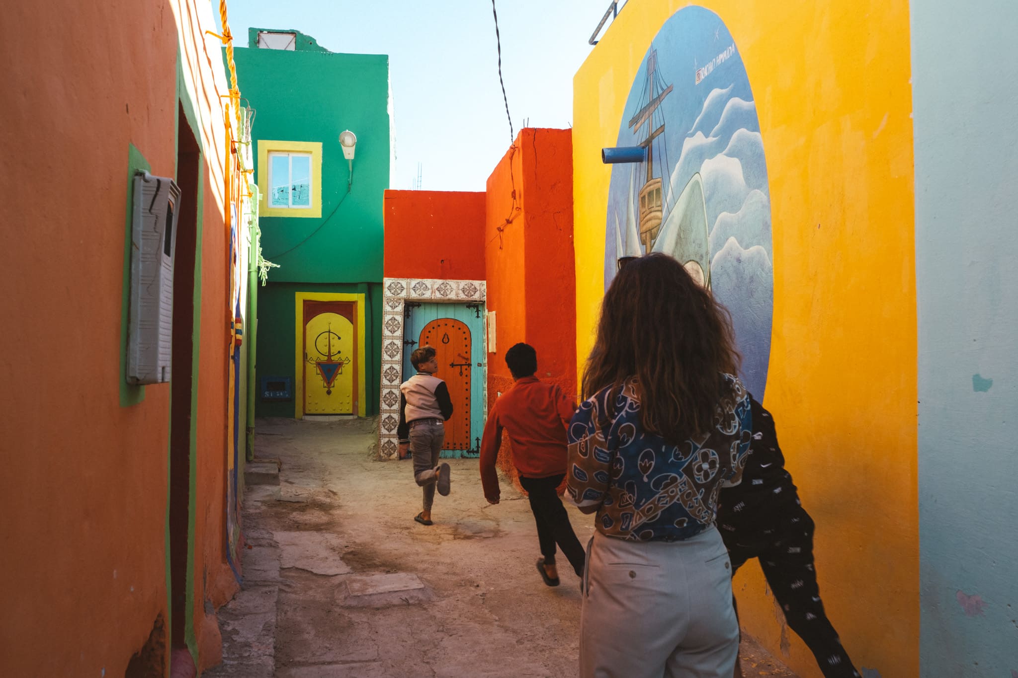 A seulement 12 minutes en voiture de Taghazout au Maroc se trouve le petit village coloré d’Aghroud. Nous sommes tombés dessus par hasard en venant d’Imsouane et avons décidé de nous arrêter, tentés par ces jolies maisons colorées. Personne dans le village, à peine quelques enfants qui jouent dans les ruelles. En même temps, cette station balnéaire attire les marocains mais principalement en été, pas en hiver.