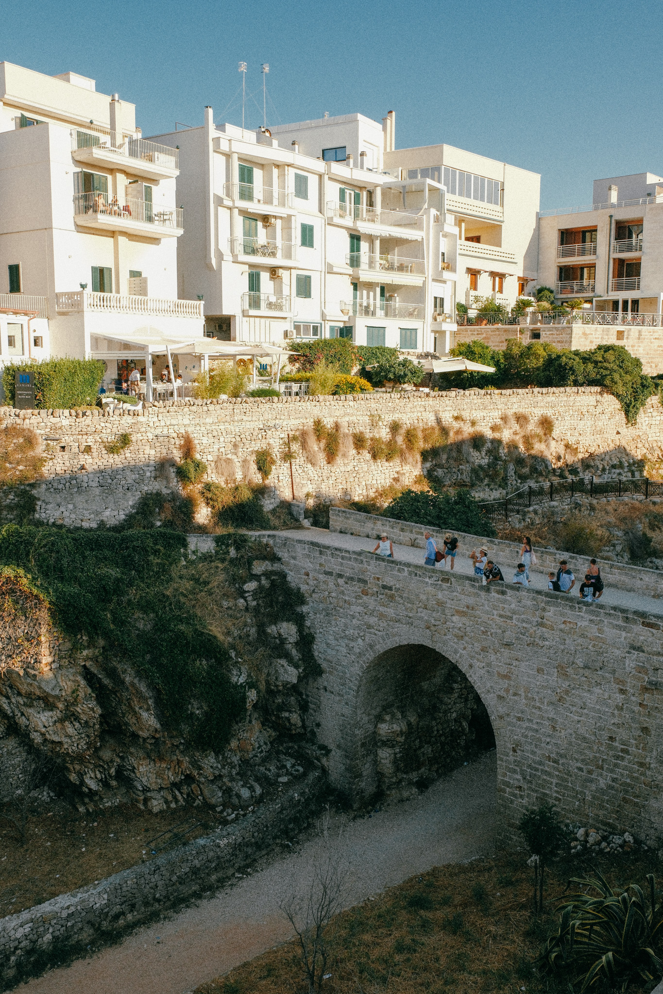 Finalement, nous voilà à la Piazza Aldo Moro. Les enfants courent, les italiens discutent sur des bancs, la vie quoi. Une délicieuse glace de chez MOREA et nous continuons la rue principale pour nous retrouver sur le Ponte Borbonico su Lama Monachile. Une construction impressionnante qui enjambe le vide entre les deux parties de la ville érigées sur deux falaises distinctes. En contrebas, un pont romain et la fameuse plage de Lama Monachile. Prenez le temps de contempler ces falaises spectaculaires sur lesquelles se trouve le quartier historique.