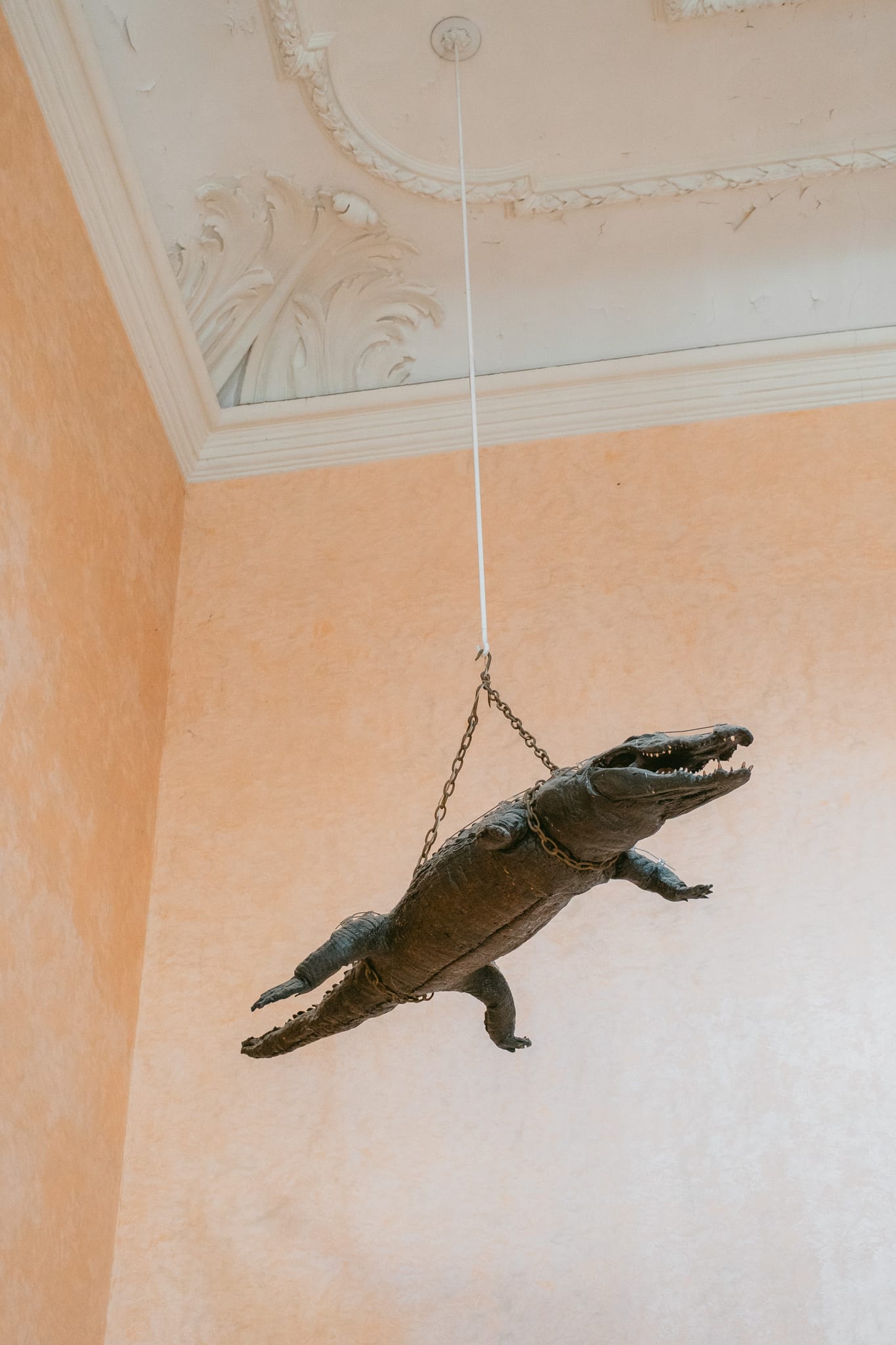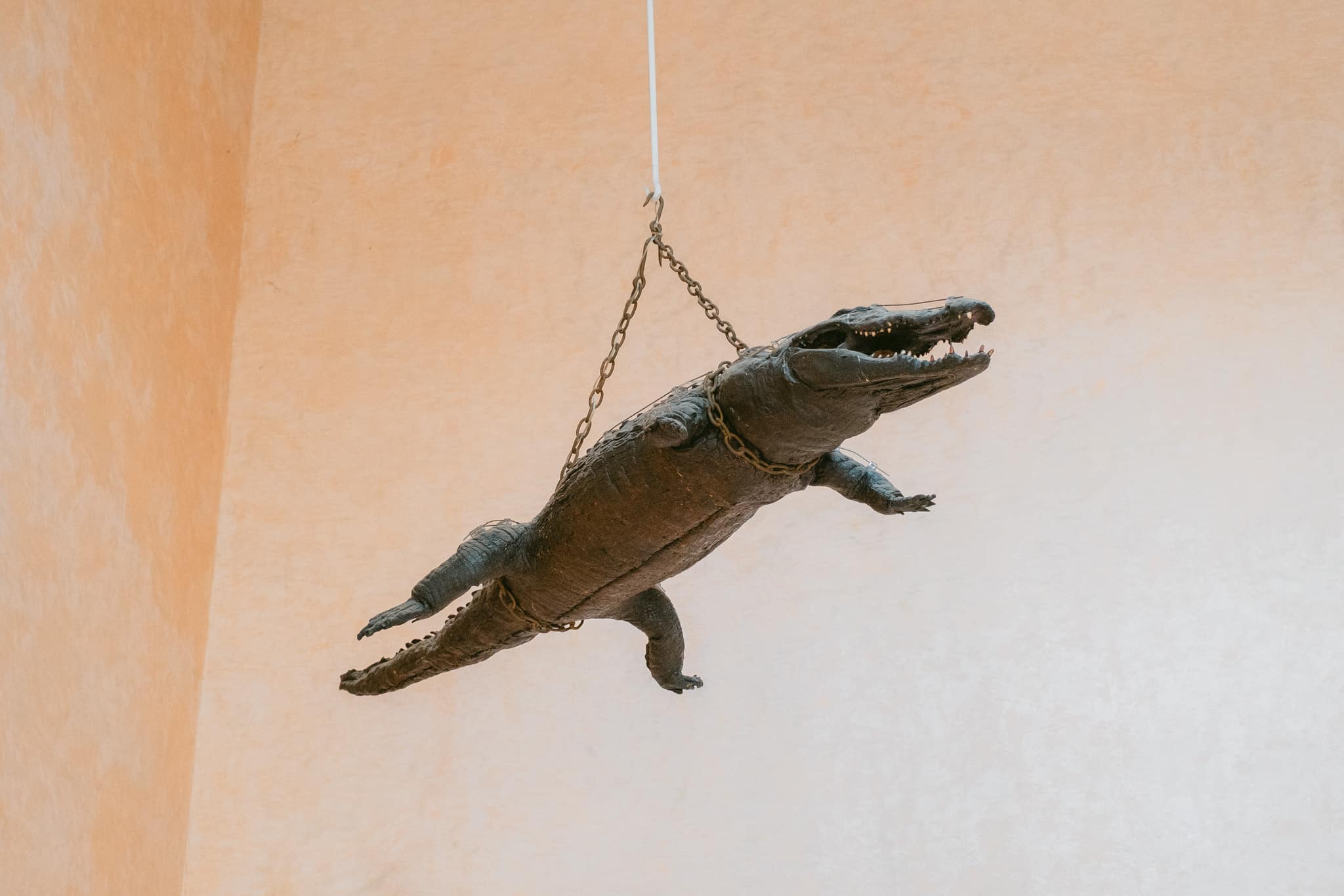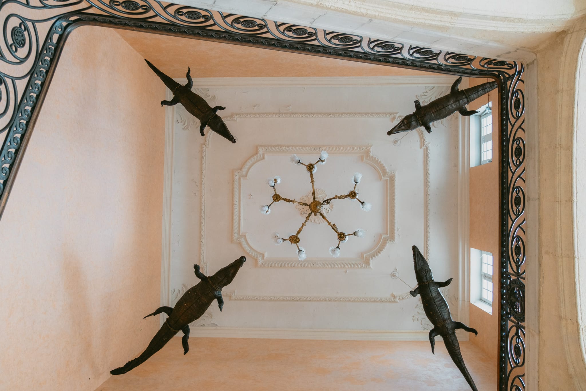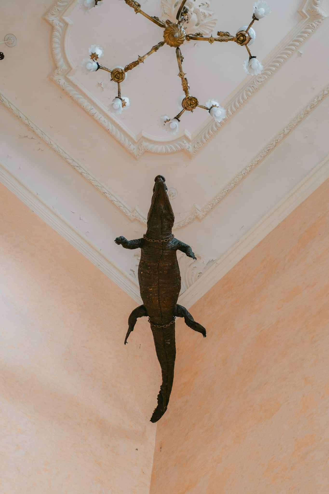 Dans cette grande cage d’escalier se trouve 4 crocodiles affamés. Pas de panique ils sont solidement attachés. Levez donc la tête si vous ne me croyez pas ! Ces énormes bestiaux sont des vrais crocodiles. Empaillés bien sur, cela va de soit. Bien que je ne mettrai pas ma main entre leur crocs pour vérifier.