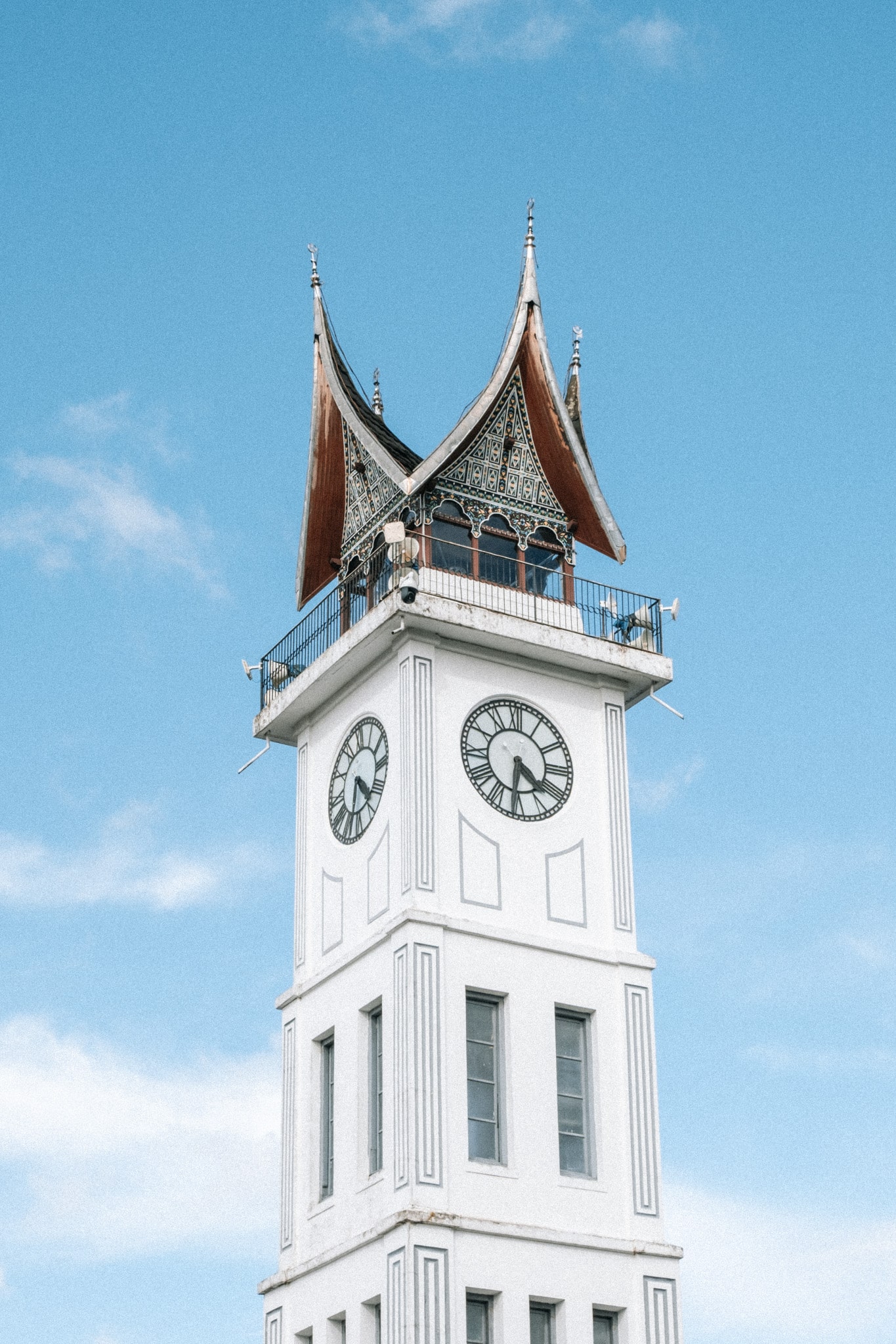 Au centre de la place, une belle horloge à l’heure au style “Big Ben” avec une petite particularité à son sommet. En effet, la réplique miniature d’une rumah de style Minangkabau avec ses fameux toits incurvés en forme de corne de buffle. Un détail qui donne tout son charme à la Jam Gadang de Bukit Tinggi.