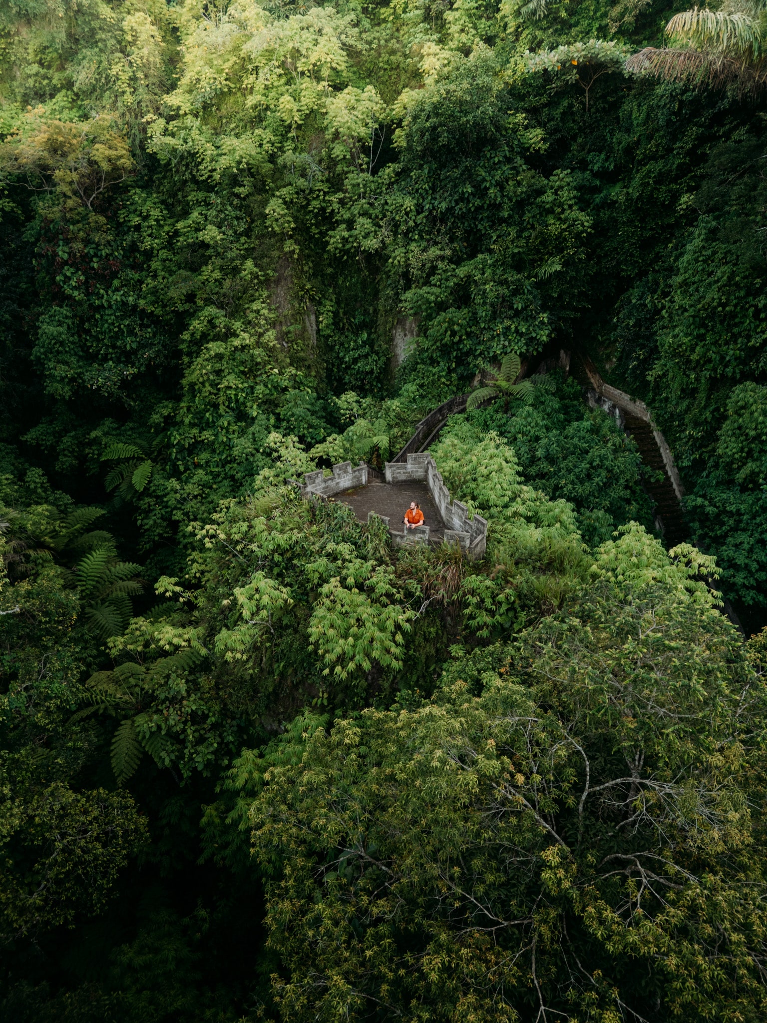 Les couleurs du coucher du soleil engloutissent les hauteurs menaçantes du canyon et dégagent les deux volcans alentours, Marapi et Singgalang, de leur prison de nuage. La hauteur des marches n’est pas à prendre à la légère et on sue rapidement avant d’atteindre le point de vue. Encore une fois, quelle construction inatendue !