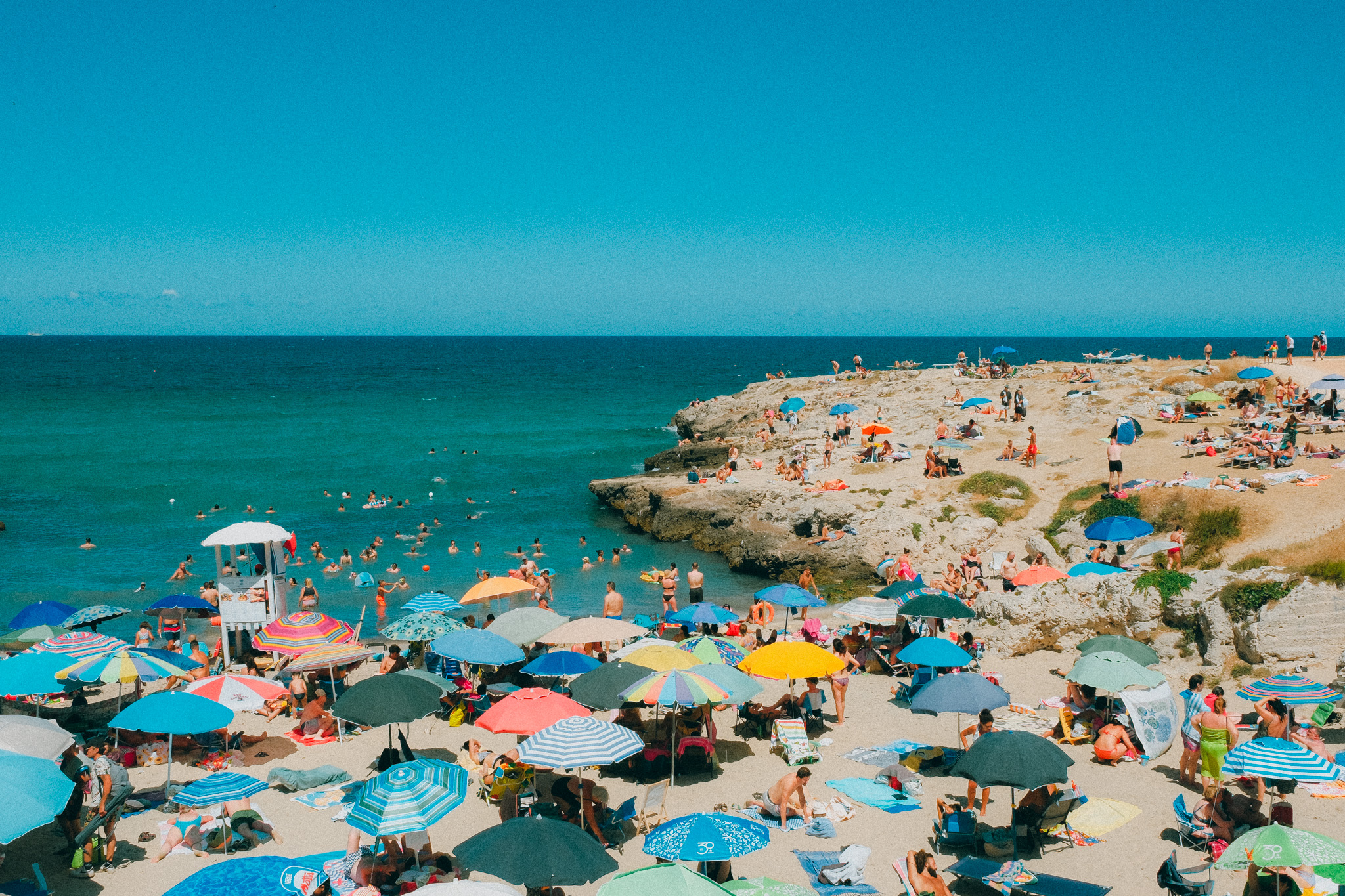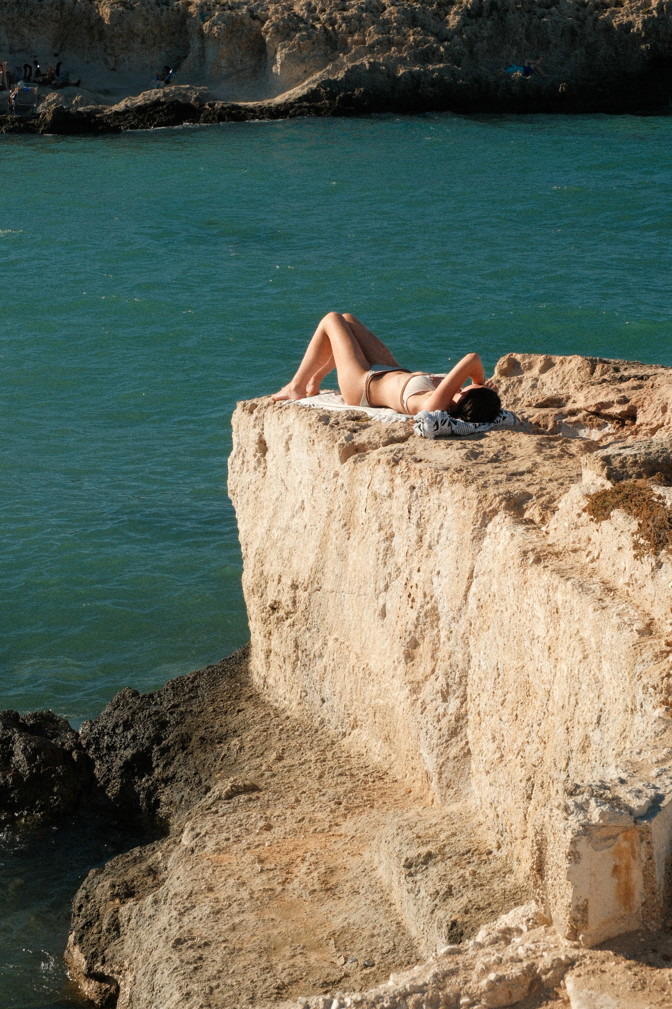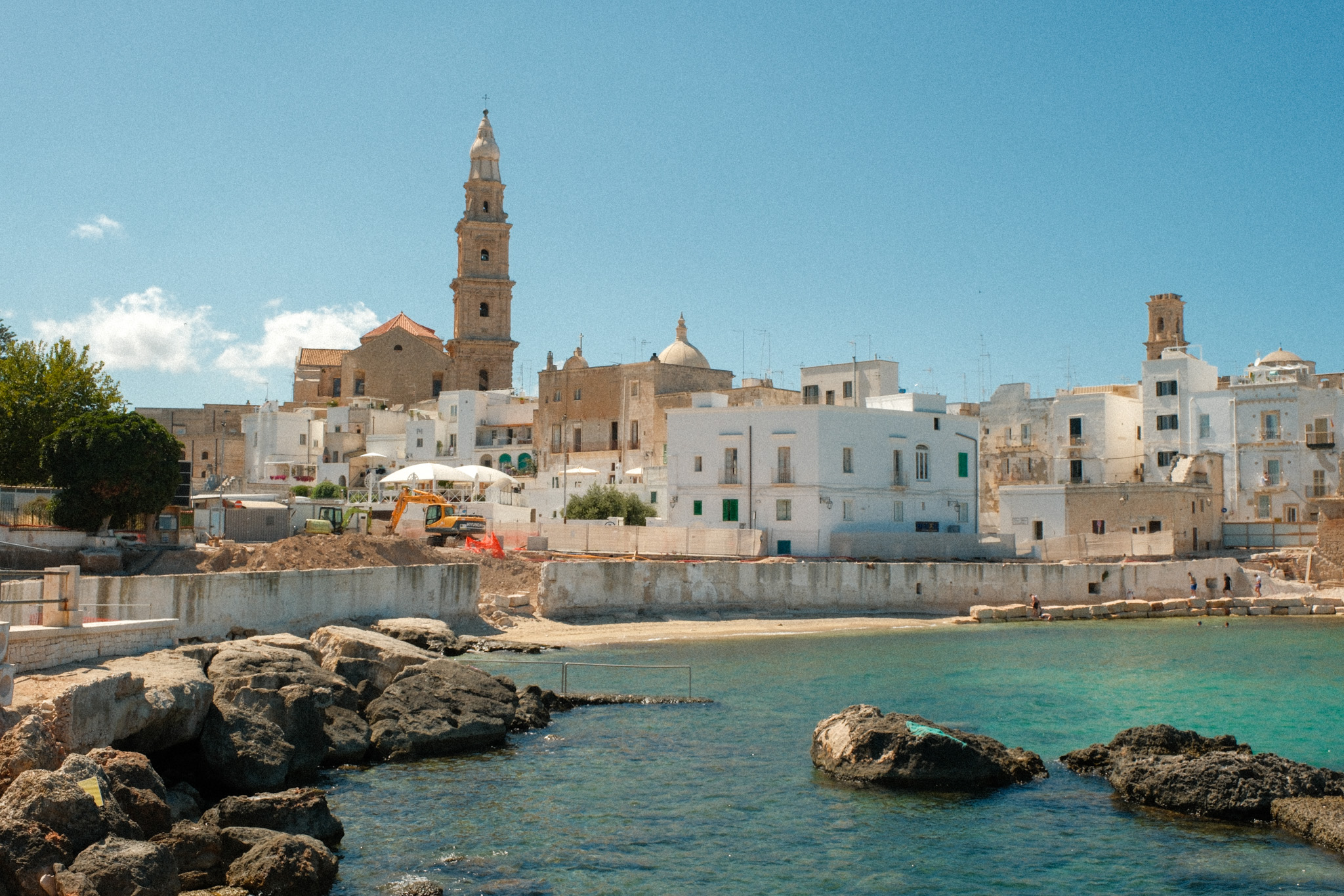 Ce que l’on a aimé au premier abord de Monopoli dans les Pouilles, c’est le fait de pouvoir respirer ! En même temps, on revenait d’Alberobello, alors ça aurait été compliqué de faire pire. La promenade le long de la mer et des petites criques nous a enchanté. Revoir des scènes de vie locale, des micros plages avec des dizaines de serviettes étendues au mètre carré avant enfin d’atteindre les remparts de la ville, c’était ça qu’on cherchait.