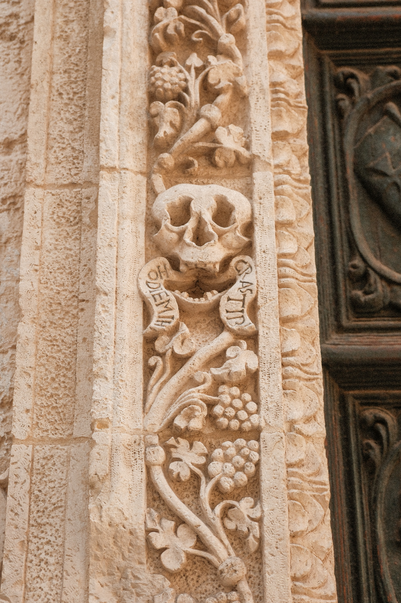 - ensuite la cathédrale baroque de Monopoli (entrée gratuite), son clocher et sa crypte. S’ensuit la visite de la chiesa di Santa Maria del Suffragio si elle est ouverte. La devanture est atypique depuis la rue. En effet, il y a beaucoup de symboles relatif à la mort d’où son petit surnom de l’église du purgatoire;