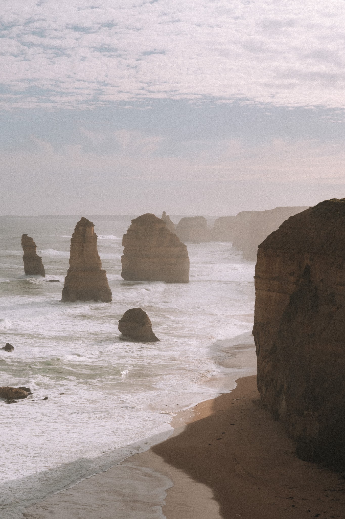 Mais c’est quoi ces 12 Apotres ? Et bien un ensemble impressionnant de formation rocheuses dans l’eau. En réalité, il y en a que huit, ne perdez pas votre temps à essayer de tous les trouver ! Comme les lieux très connus et photographiés des milliers de fois, nous attendions beaucoup ce panorama. Et bien nous n’avons pas été déçus ! Même si la lumière n’était pas la meilleure du monde, cette espèce de brume rend l’ambiance mystérieuse.
