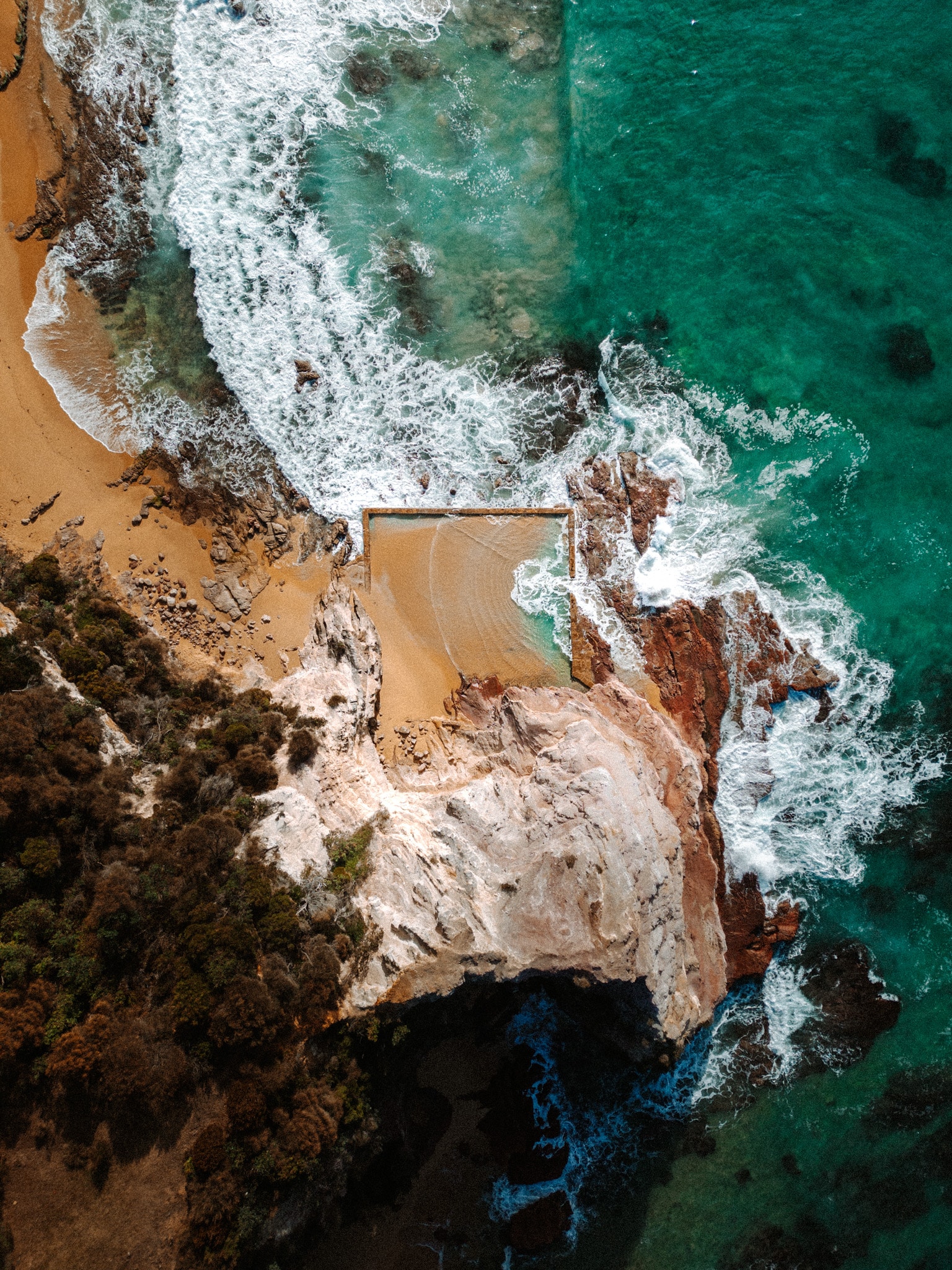 Eden est une petite ville côtière très agréable. Les BBQ public et tables de picnic en font un très bon spot pour déjeuner. Vue sur la mer, pieds à la limite du sable. La Rock Pool est caché en contrebas dans les falaises. On peut y accéder en passant par l’Est de la plage. Vue du ciel elle est plutot cool ! Vous en pensez quoi ?