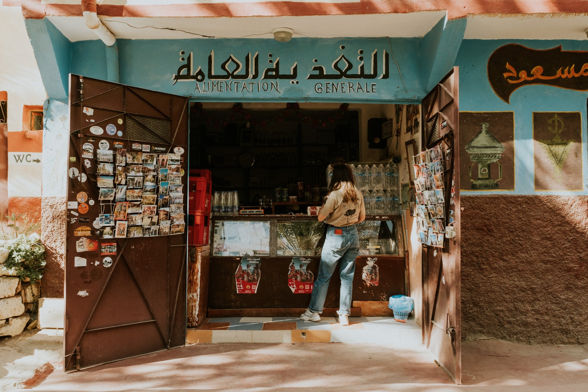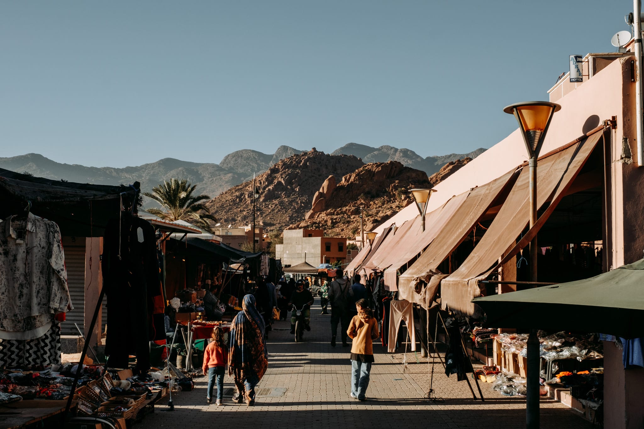 🛍️ Jour 1 : Arrivée au village, souk et achats de souvenirs, finir la journée par le coucher du soleil sur les roches peintes.