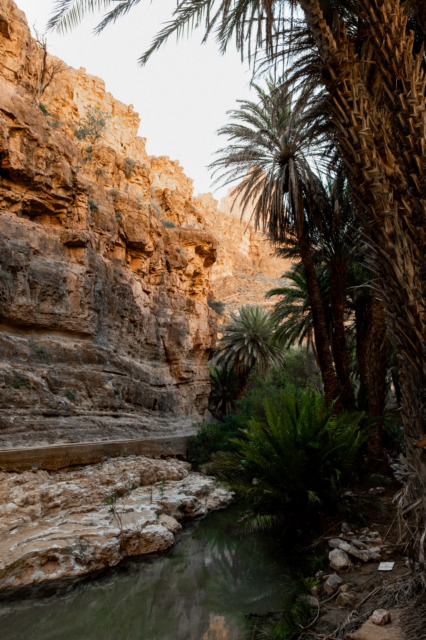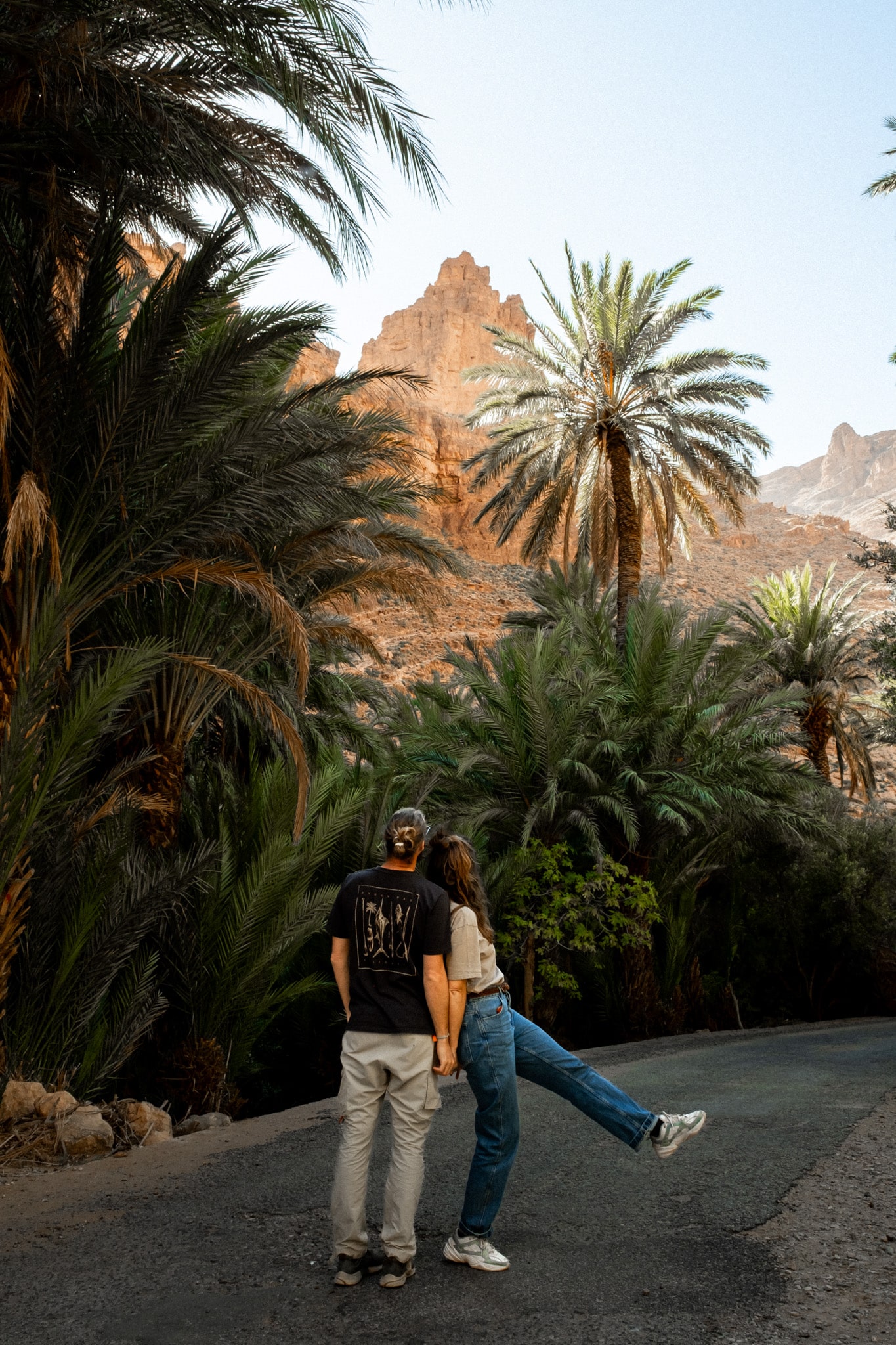 Garé au parking, nous avons commencé par la visite du micro village après le pont avant de remonter par les gorges. Nous pensions nous être perdus et avons fini par remonter par les terrasses du village précédent sous le regard perplexe d’une vieille dame qui gardait ses chèvres. Nous avons continué notre route de l’autre côté toujours à l’ombre des palmiers avant de faire le retour par la route. Sans itinéraire ou randonnée précise, nous nous sommes laissés allé au grés de nos envies. Mais c’était super chouette de pouvoir se balader dans l’oasis et de voir l’organisation des terrains ainsi que les systèmes d’irrigation mis en place.