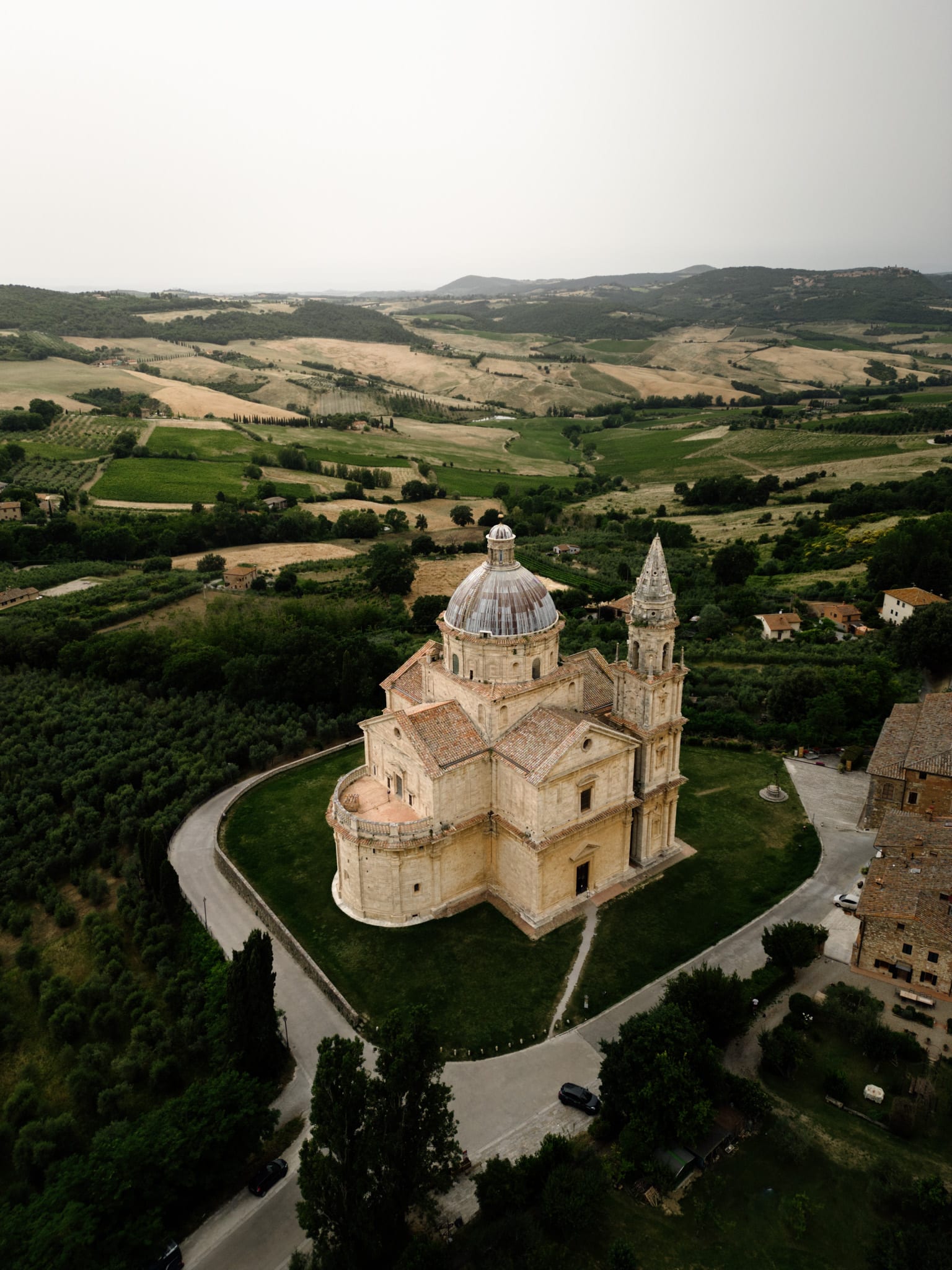 La chapelle Madonna di Vitaleta fut notre coup de cœur du voyage. Ce splendide petit bâtiment se situe au milieu des champs sur une colline un peu plus en hauteur. Son esthétisme presque minimal nous a inspiré de belles photos à faire sur terre comme dans les airs (après avoir demandé l’autorisation). Bien que nous soyons en Juin, très peu de touristes sur place. Nous devons être une petite dizaine et pourtant nous sommes restés plus d’une heure sur place.