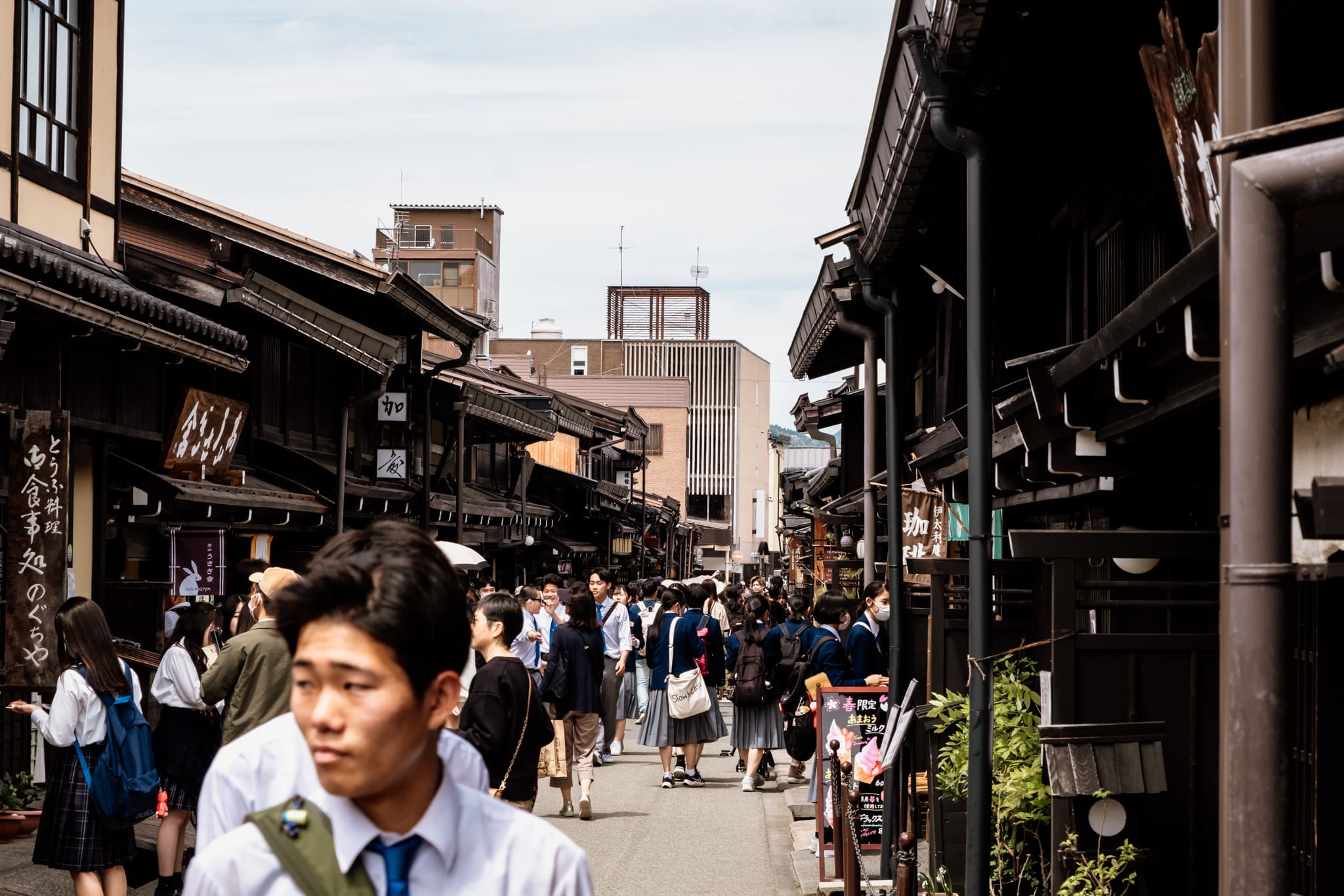 Connue pour son atmosphère traditionnelle, Takayama est une petite ville où il fait bon se perdre. L’attraction principale ? Ses marchés matinaux à visiter avant 10h. Nous avons visité en fin de journée le quartier de Sanmachi Suji avec ses anciennes résidences de marchands et le village traditionnel d’Hida, accessible en vélo !