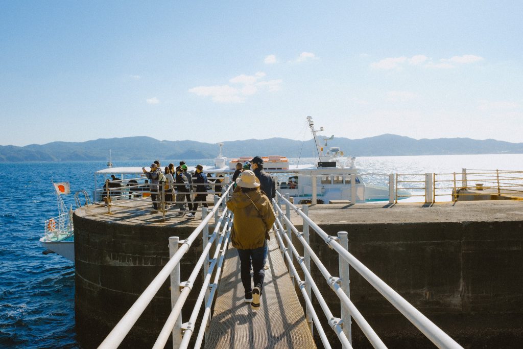 Pour atteindre Gunkanjima, vous devez rejoindre l’un des tours organisés qui partent plusieurs fois par jour depuis différents endroits du port de Nagasaki. Le trajet en bateau dure environ 30 à 40 minutes en fonction des conditions. Il faut garder en tête que les tours peuvent être annulés en cas de mauvais temps ou d’autres conditions défavorables. En effet, si les vagues sont trop grosses le bateau ne pourra pas accoster sur la jetée de Gunkanjima et ça arrive relativement souvent. Le tour se transforme alors en “Gunkanjima Tour Cruise” avec un remboursement de 10% des tickets.