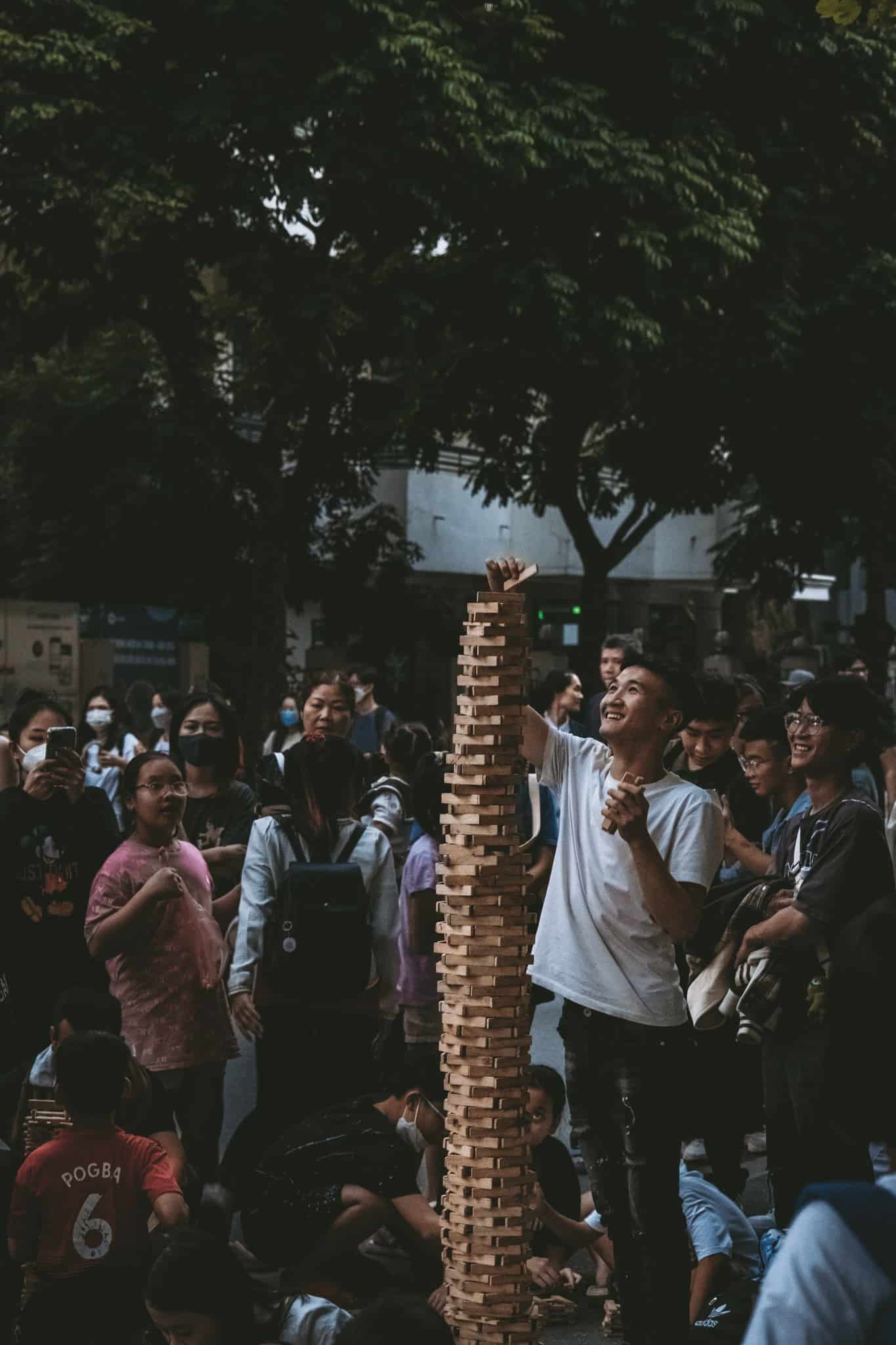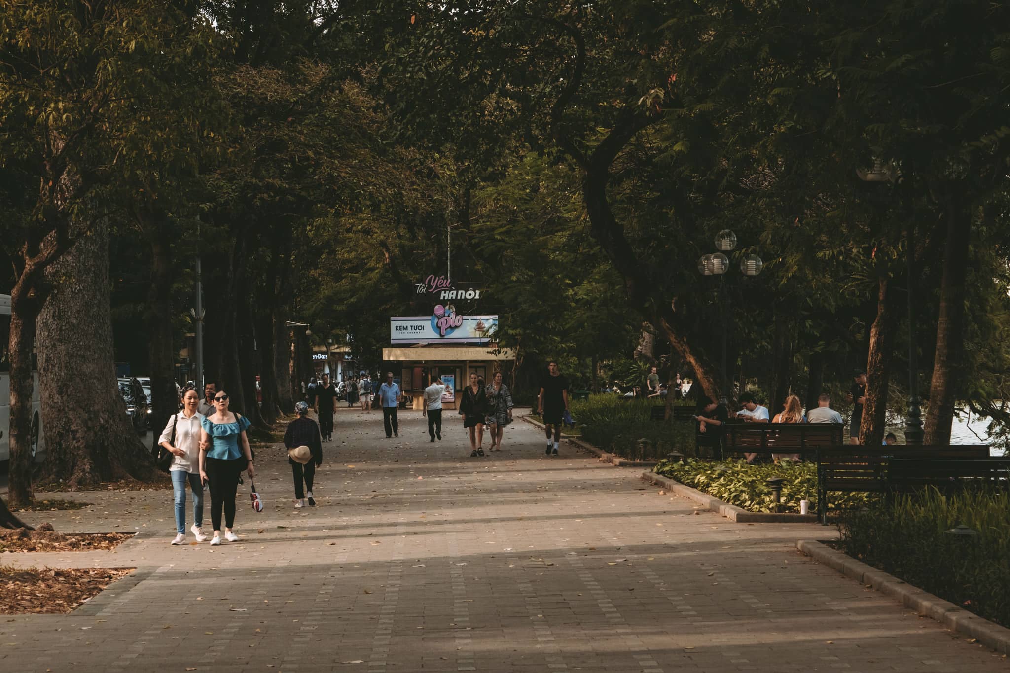 Le weekend les abords du lac se métamorphosent. La rue devient entièrement piétonne et s’anime. Comme l’impression que tout Hanoi s’y donne rendez-vous. Les terrasses sortent leur plus beau tabouret qui ne cessent d’accueillir de nouveaux clients pour déguster un pigeon grillé. Les joueurs de Da Cau profitent de l’absence de voiture pour prendre leur aises. Stands de boissons, glaces, street food, les mains des Vietnamiens ne sont jamais vides !