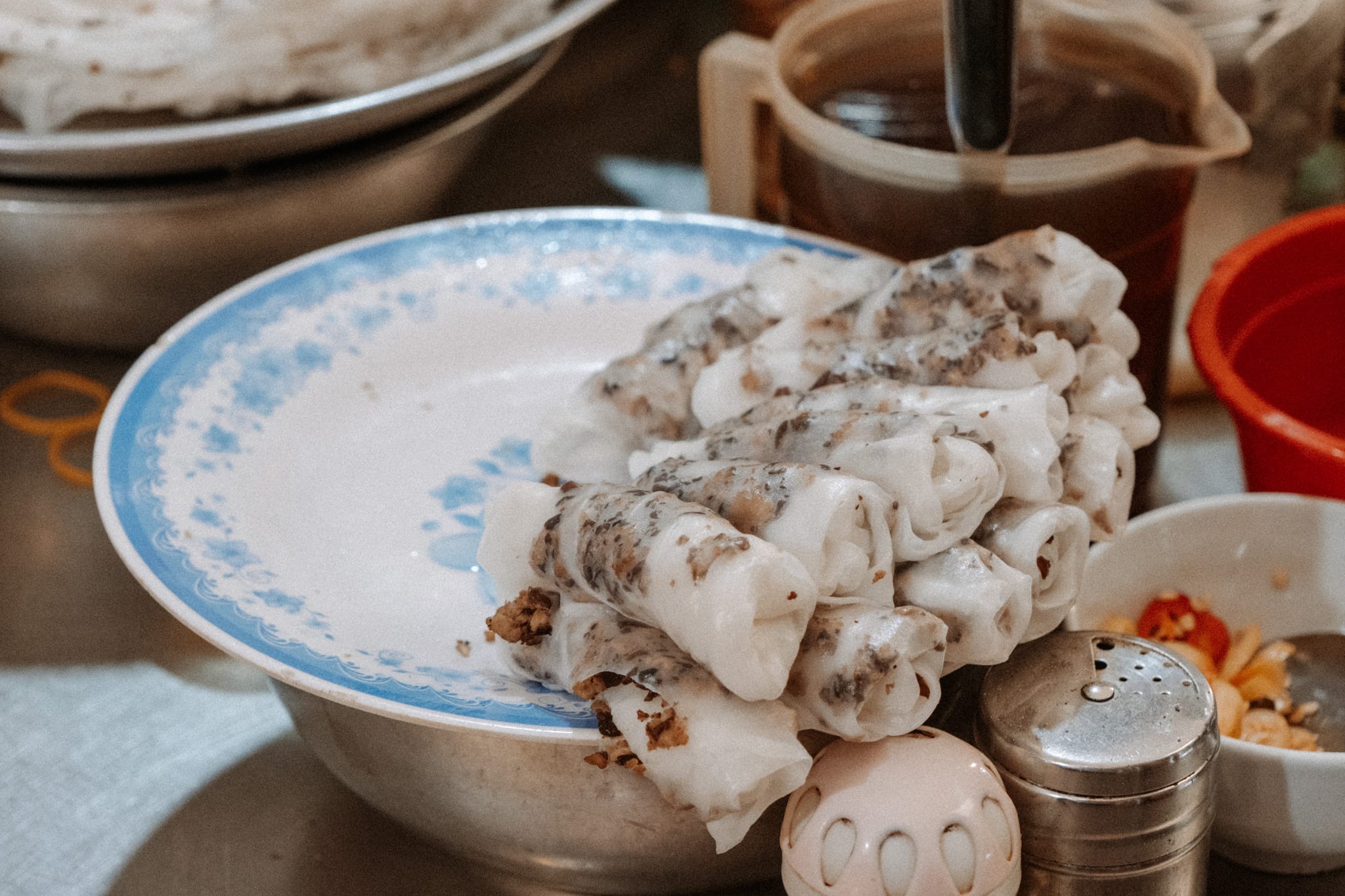 Bánh cuốn : Des crêpes de riz fraîches et légères farcies de porc haché, de champignons et d’oignons frits, servies avec des herbes aromatiques et de la sauce nuoc cham;