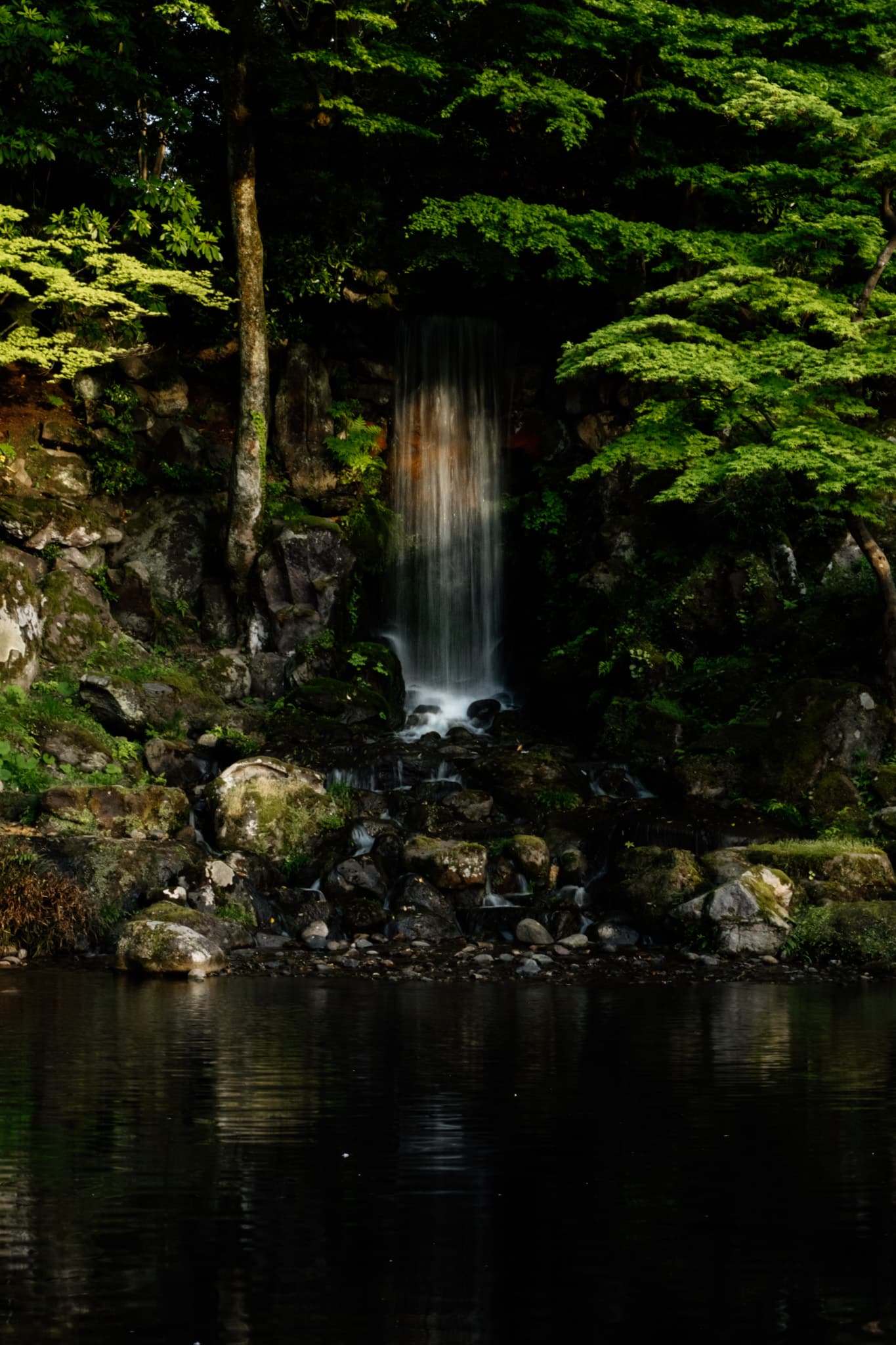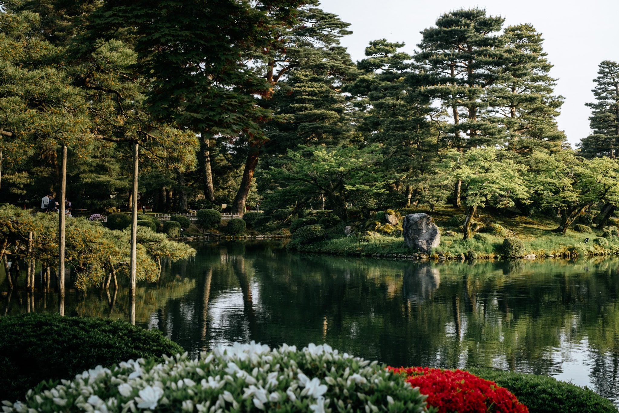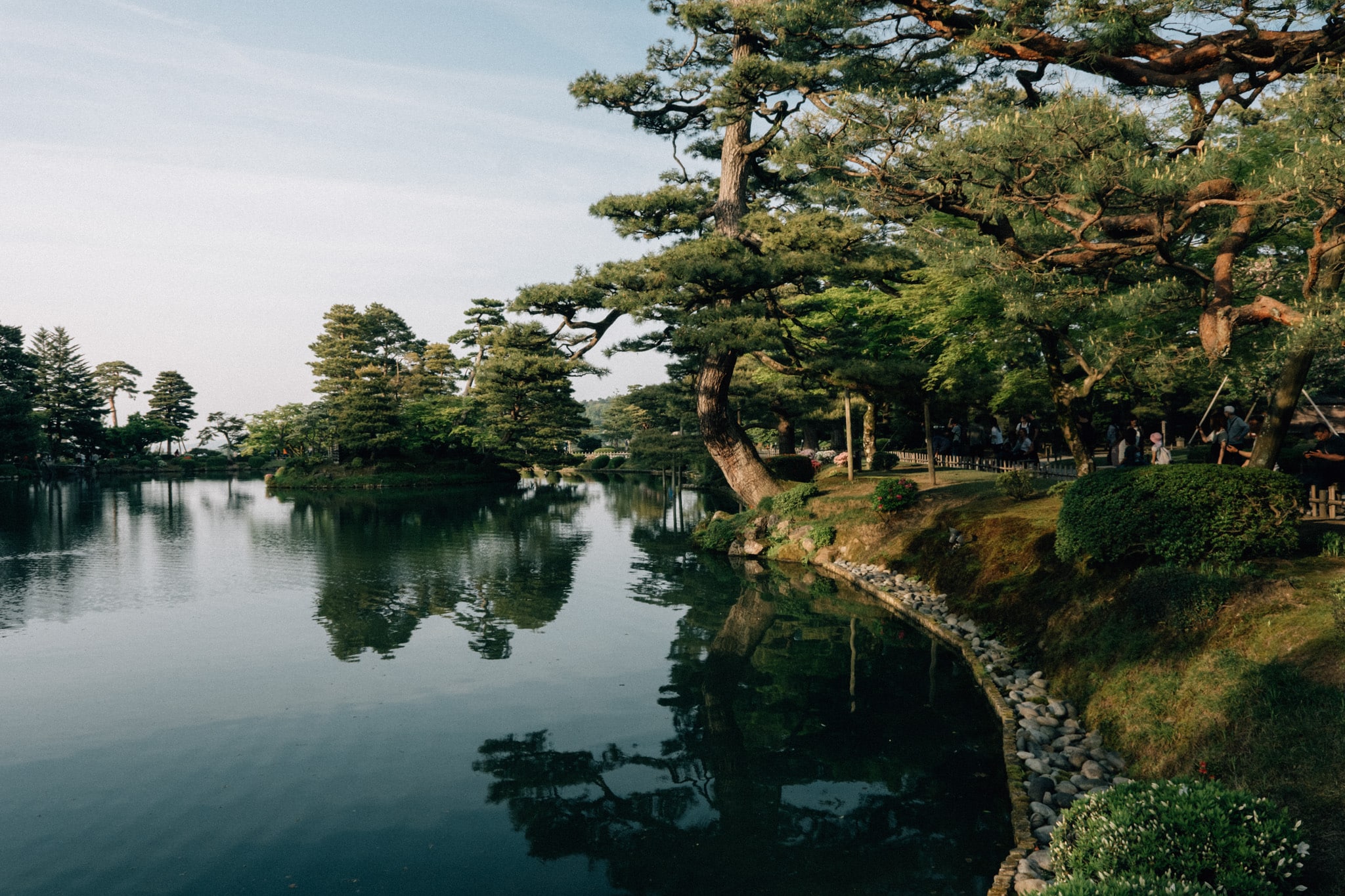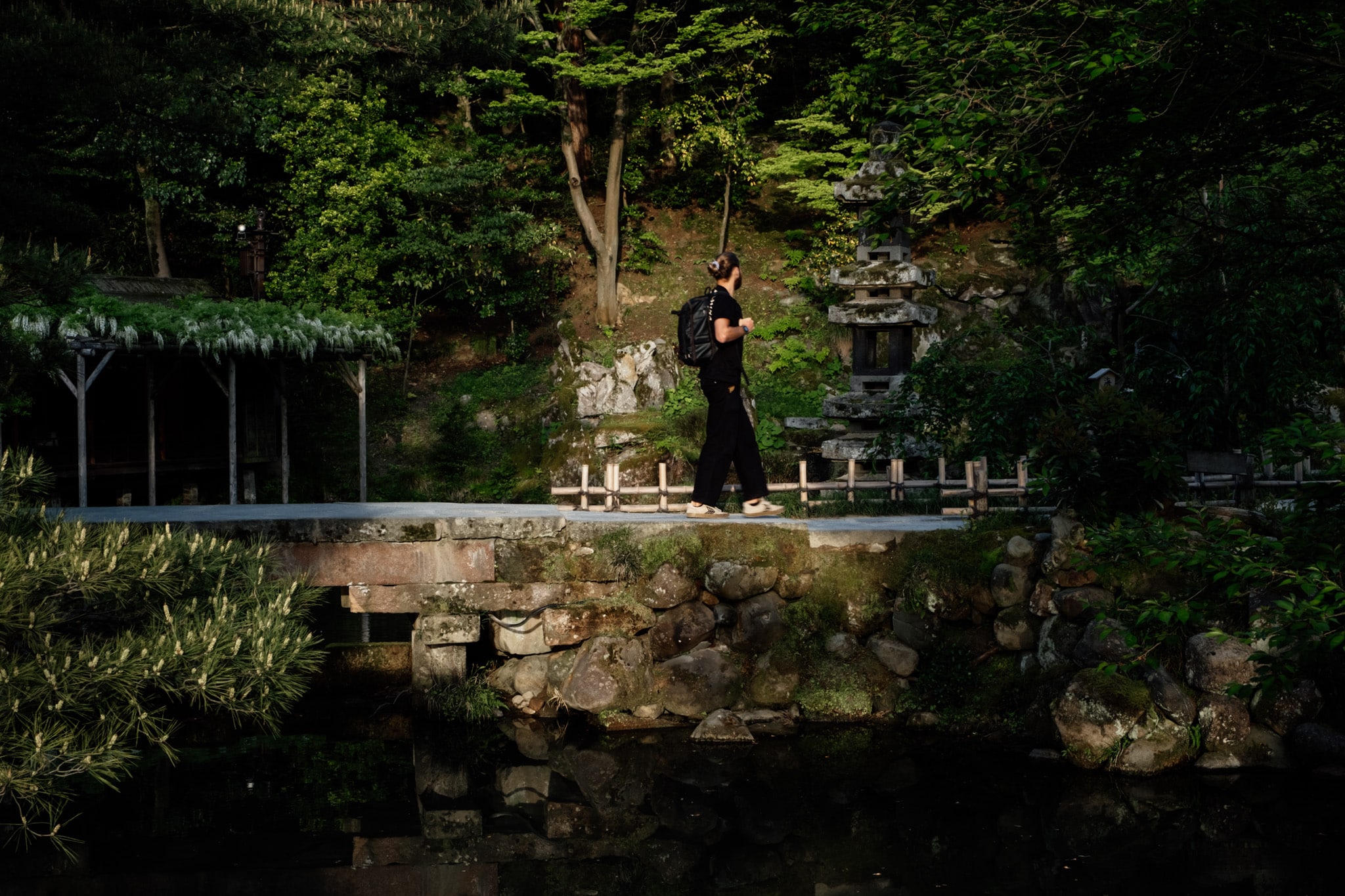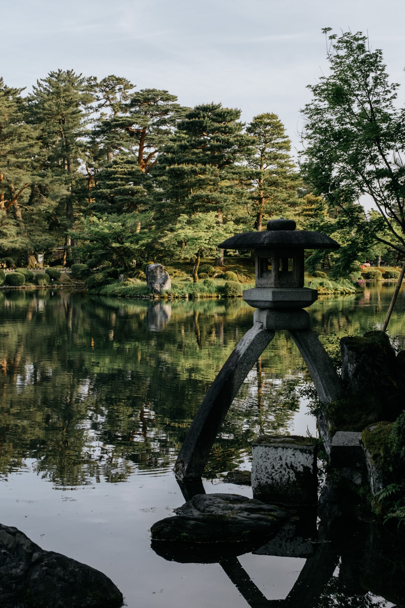 Durant le parcours, on retrouve de nombreux éléments de la culture traditionnelle japonaise comme cette lanterne de pierre au bord de l’étang Kasumigaike. En hiver, la neige recouvre les arbres et sculptures, créant une scène digne d’une estampe japonaise. Au printemps, les pruniers et les cerisiers en fleurs transforment le jardin en un tableau éclatant de couleurs. Lors de notre venue, il n’y avait pas l’installation avec les cordes suspendues que l’on retrouve sur beaucoup de photos.