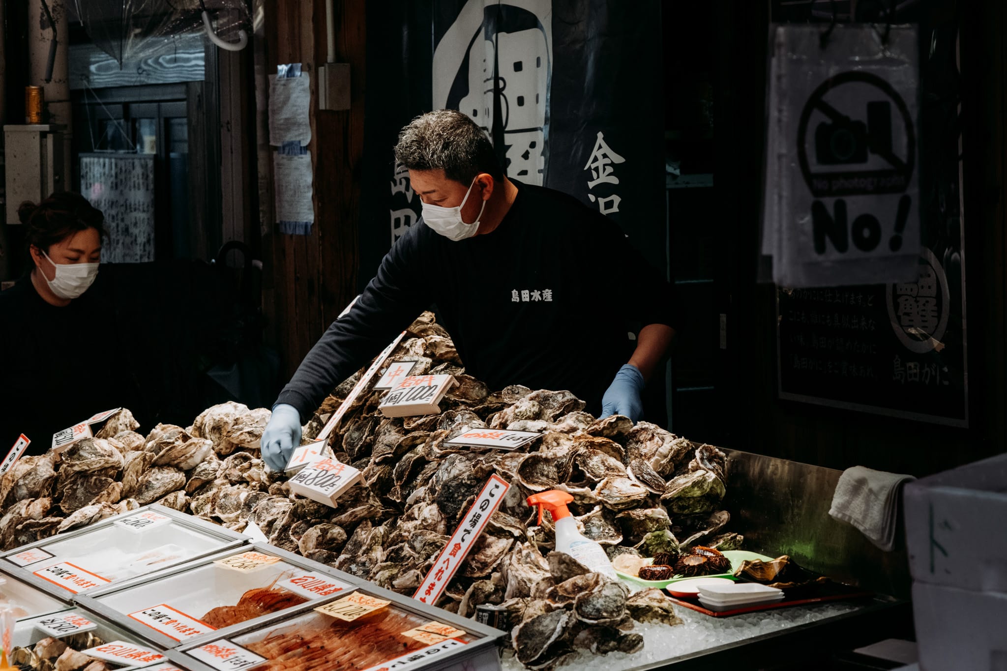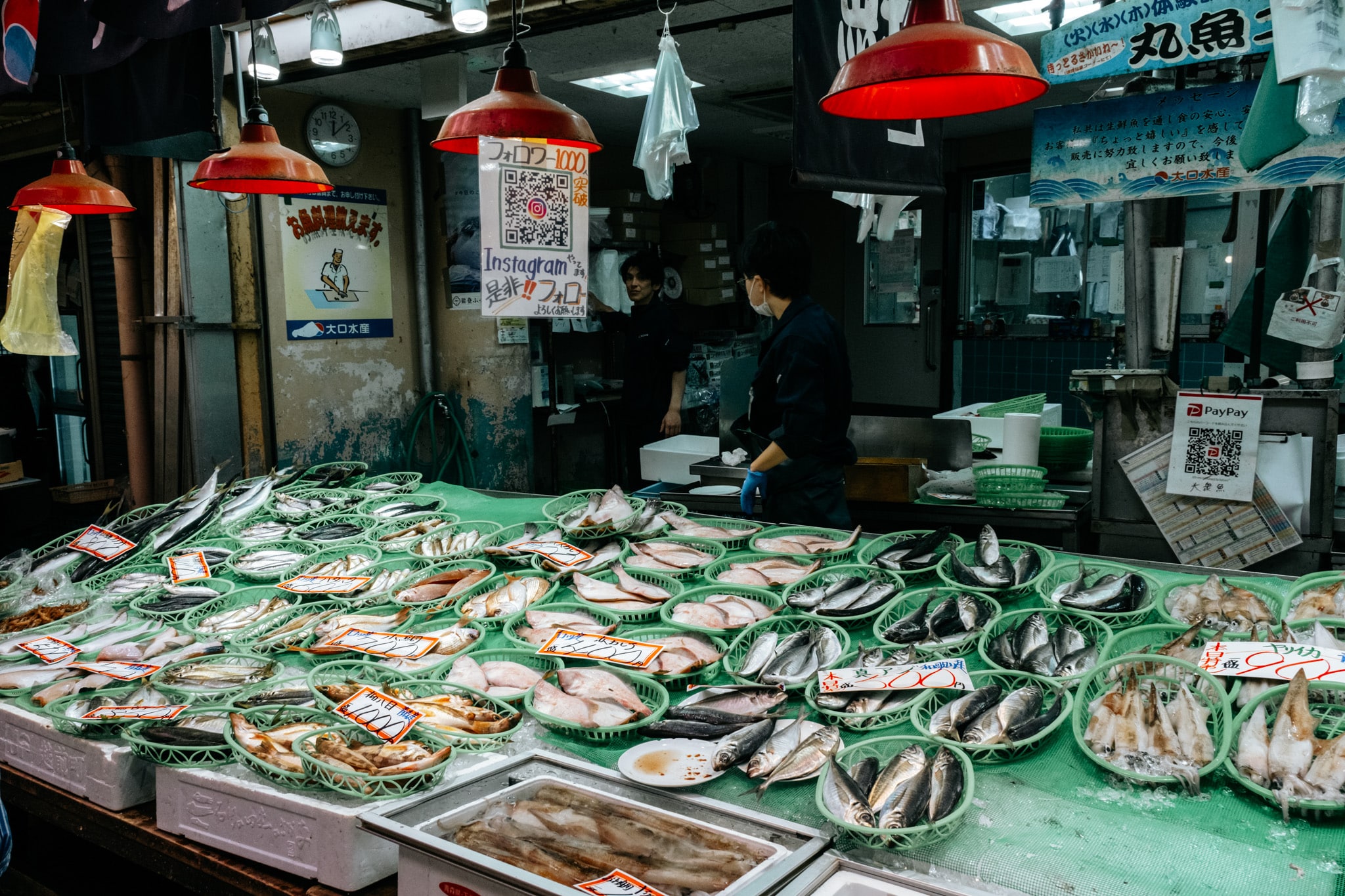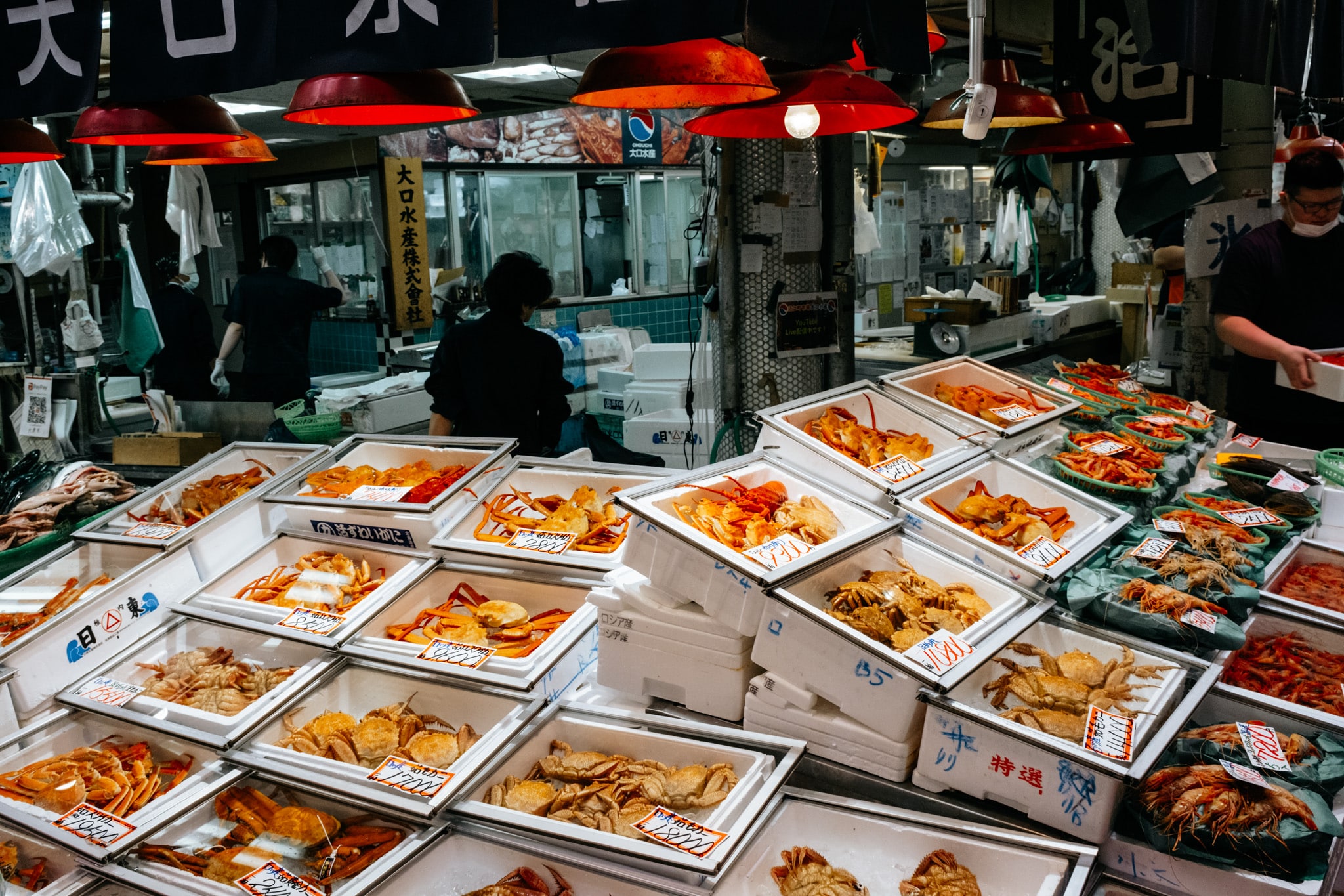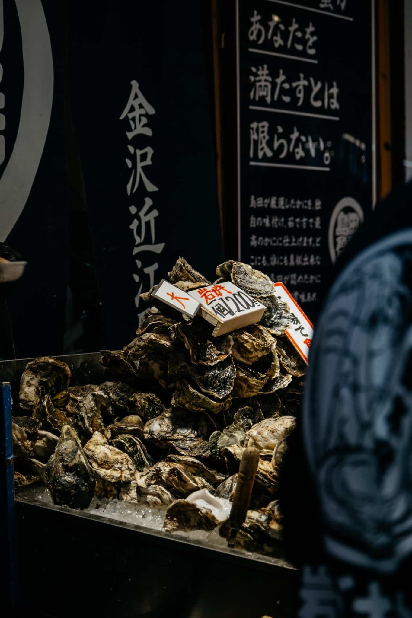 Les regards sont tout de suite attirés par la taille et la couleur de certaines étales. Des huitres grosses comme une cuisse, ou une araignée de mer qui nous hérisse les poils par sa grandeur. Certaines débordent de fruits de mer fraîchement pêchés, des légumes locaux colorés, des fruits exotiques et de poissons tout juste détaillés. On comprend mieux d’où vient la réputation sur le poisson de Kanazawa.