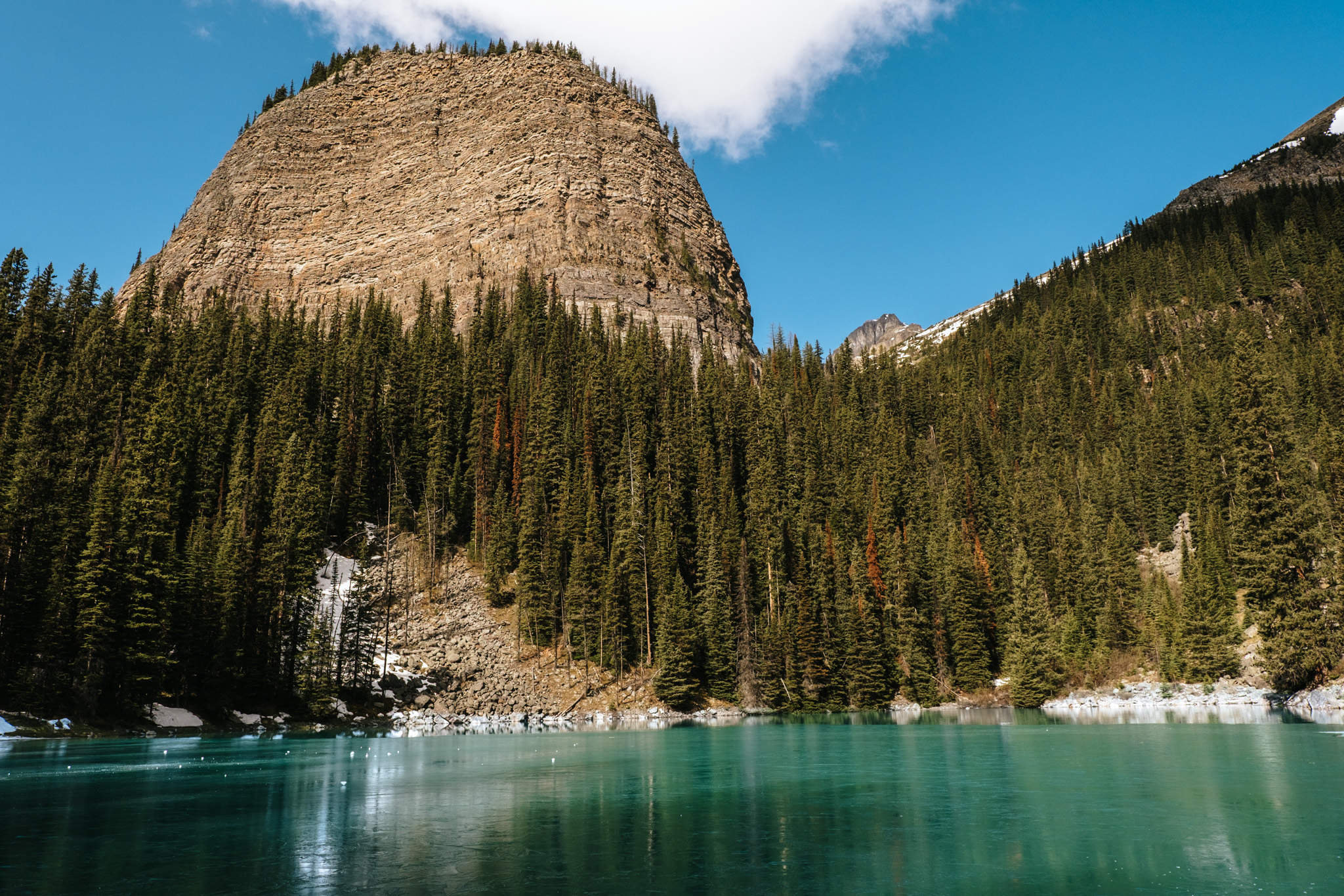 Le Lac Louise, plus grand et plus accessible, est encadré du Château Fairmont qui domine la rive est, et le glacier Victoria qui scintille au fond de la vallée. Son bleu-vert laiteux et ses eaux parfaitement calmes en font un spot photo légendaire.
