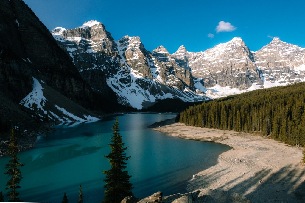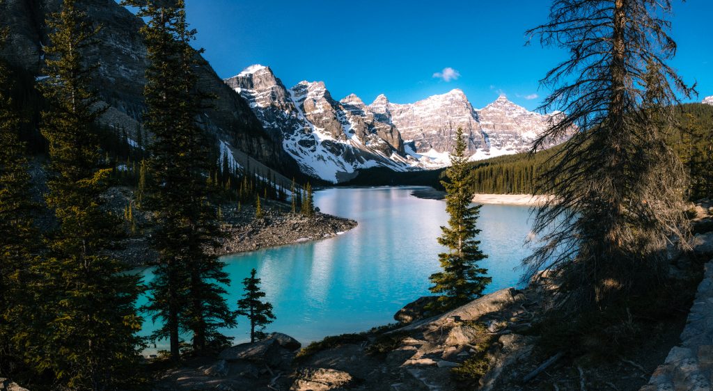 Le Lac Moraine, avec sa teinte bleu électrique presque irréelle et les Dix Pics qui l’encadrent. C’est celui qu’on voyait sur les anciens billets de 20 dollars canadiens, et pour cause : c’est l’image parfaite des Rocheuses canadiennes.