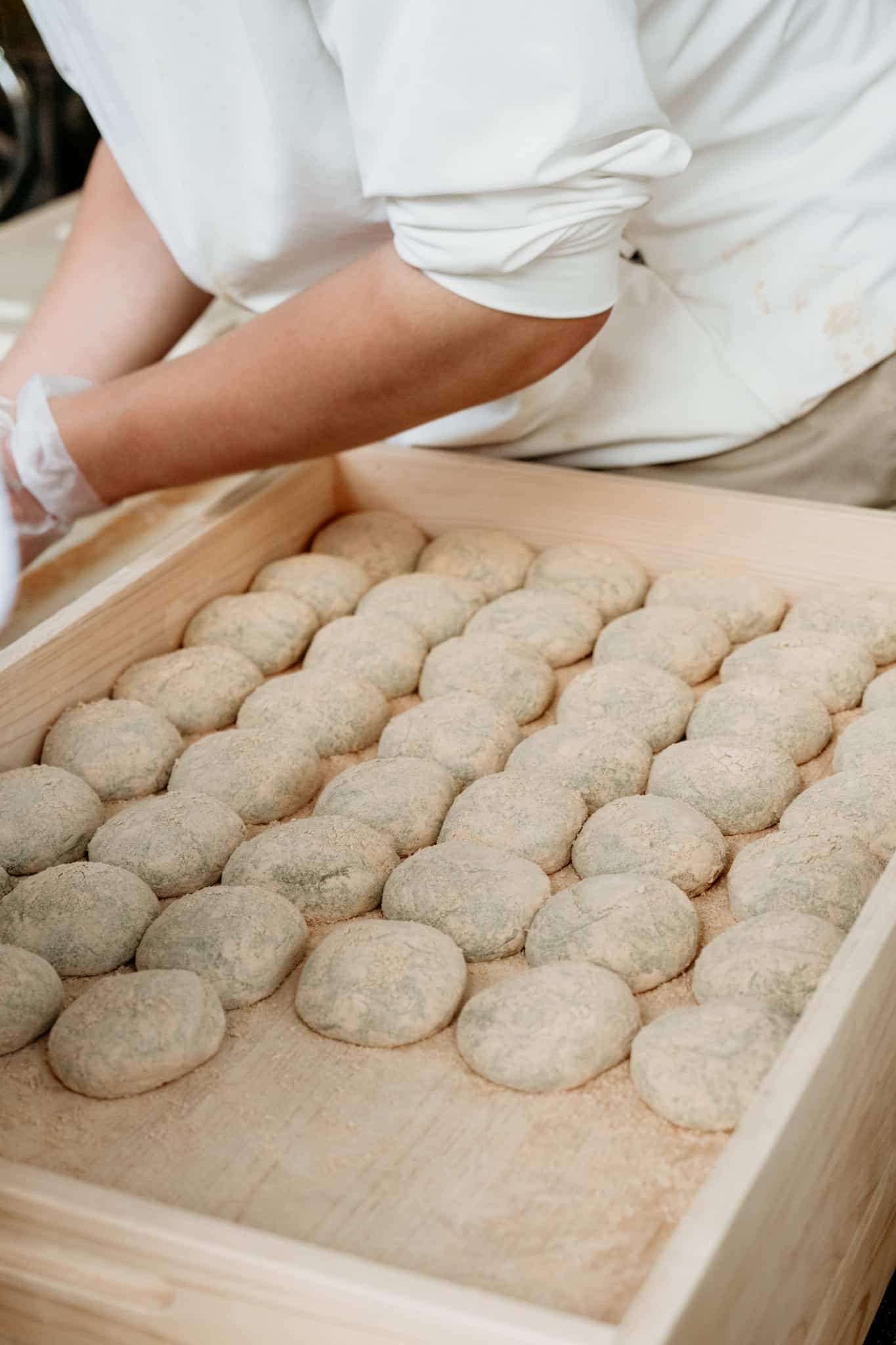 Sans aucun doute, les meilleurs mochis que nous ayons mangé au Japon ! D’ailleurs, savez-vous pourquoi sont-ils vert ? Nakatanidou sert des mochi à base de yomogi soit de l’armoise en français, un herbacé qui ressemble un peu à du persil et d’un vert intense. L’insert est une pate de haricots rouge classique et le tous est saupoudré d’une farine de soja torréfiée. Un délice ! Nous y sommes retournés plusieurs fois pour assister au Nakatanidou Mochi Show et à chaque coup, c’était blindé de monde. L’heure de début est affiché sur le magasin. La file d’attente pour acheter des mochis va très vite ceci dit.