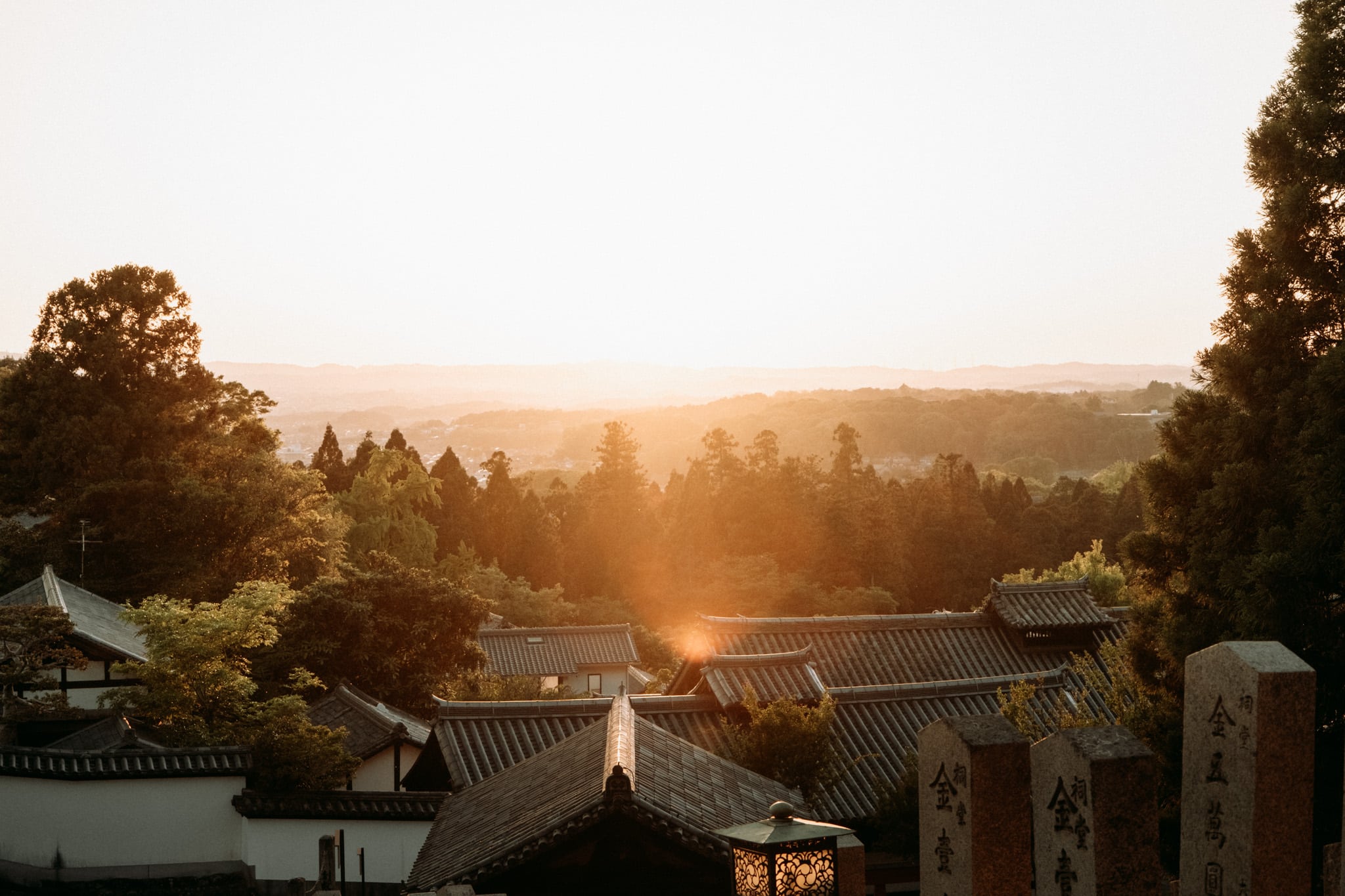 Un temple dont on n’avait pas vraiment entendu parlé mais qui est idéalement situé pour observer le soleil se coucher. Situé sur les hauteurs de la montagne Wakakusa, il surplombe le parc et la ville de Nara.