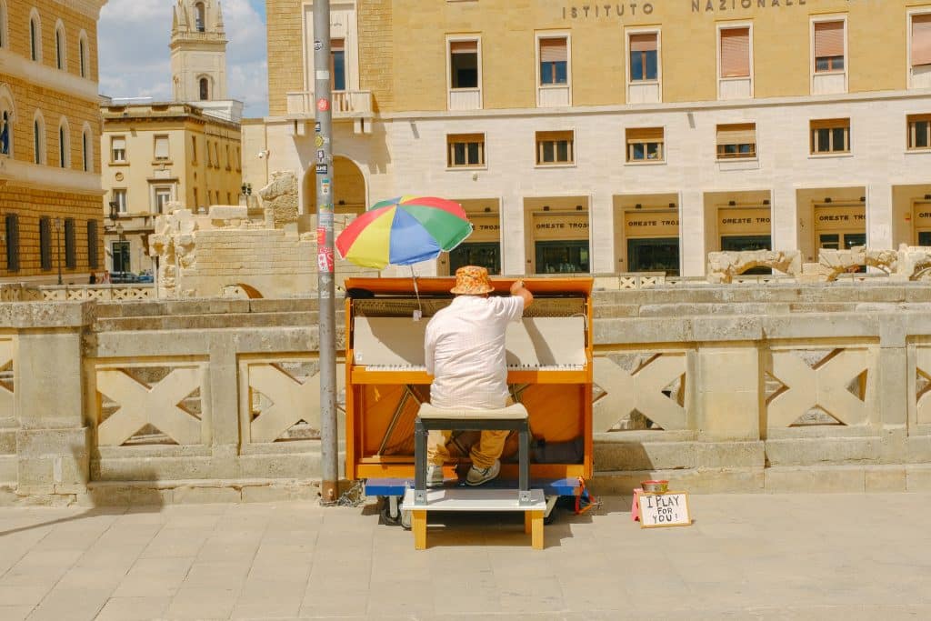 Bienvenue à Lecce, surnommée la « Florence du Sud ». Ici, chaque façade raconte une histoire à travers ses sculptures baroques de la Renaissance. On flâne dans les ruelles, on admire la Basilique Santa Croce aux détails sculptés époustouflants, on traverse la Piazza del Duomo avec son duomo majestueux et on s’étonne devant l’amphithéâtre romain, vestiges de l’histoire antique de cette perle d’Italie du Sud. On en profite pour goûter un pasticciotto en regardant le joueur de piano.