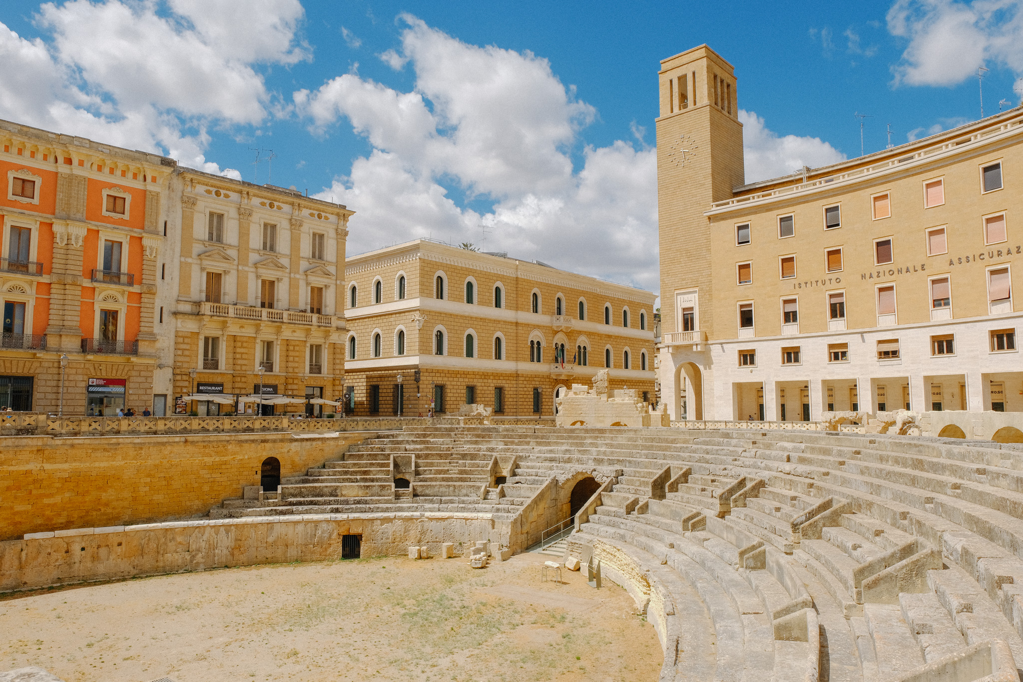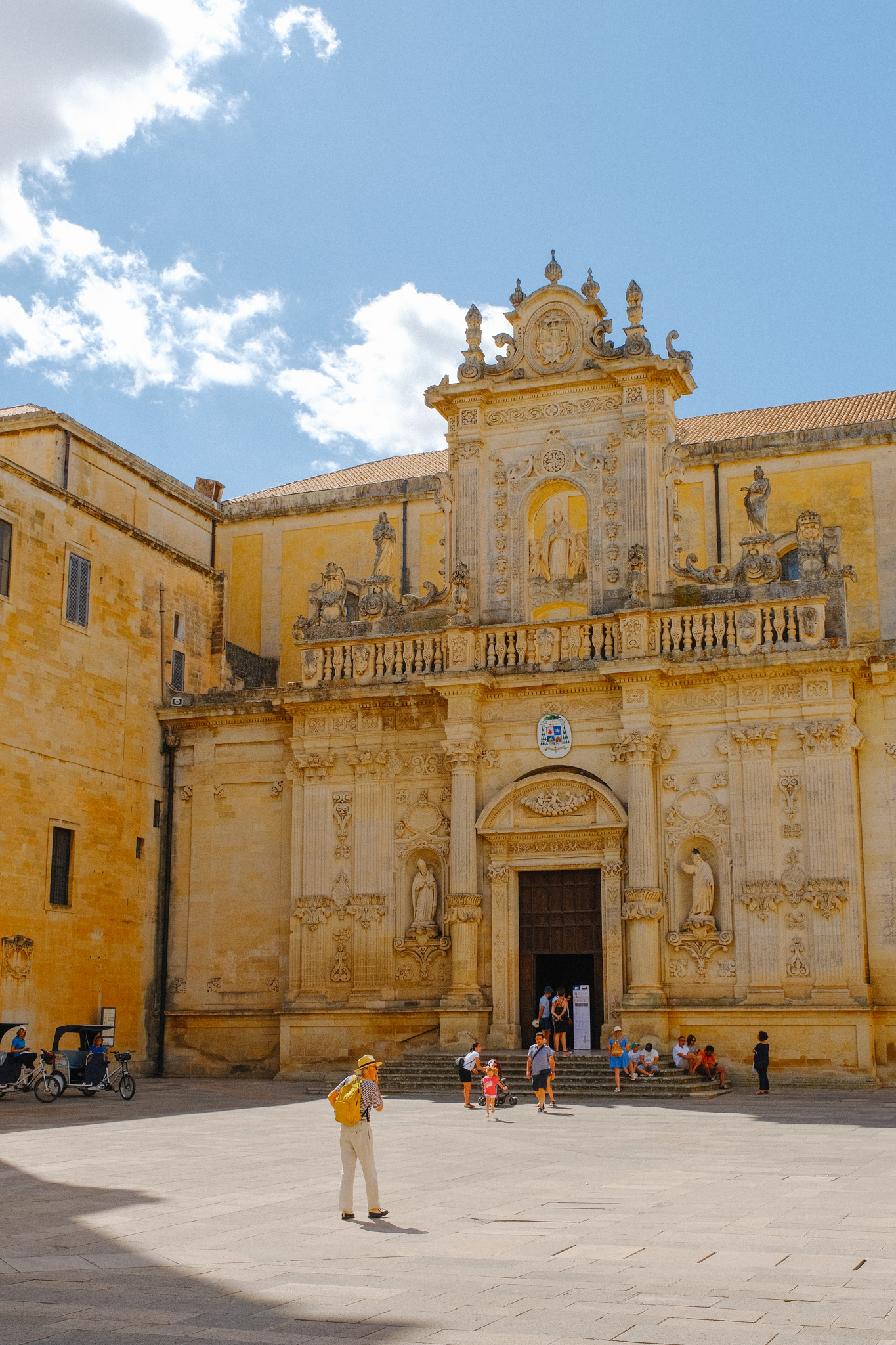 Bienvenue à Lecce, surnommée la « Florence du Sud ». Ici, chaque façade raconte une histoire à travers ses sculptures baroques de la Renaissance. On flâne dans les ruelles, on admire la Basilique Santa Croce aux détails sculptés époustouflants, on traverse la Piazza del Duomo avec son duomo majestueux et on s’étonne devant l’amphithéâtre romain, vestiges de l’histoire antique de cette perle d’Italie du Sud. On en profite pour goûter un pasticciotto en regardant le joueur de piano.